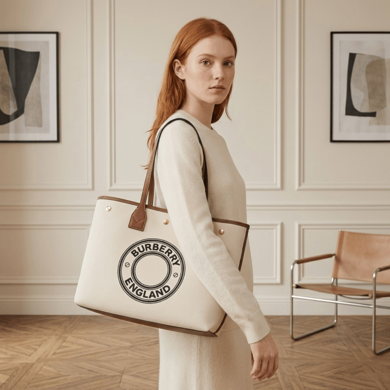 A structured everyday tote crafted from durable canvas, featuring the signature Burberry circular logo print and finished with smooth leather handles and gold-tone hardware. Designed in a balanced medium size, it offers practical space for daily essentials while maintaining a clean, modern luxury aesthetic ideal for both casual and refined styling.