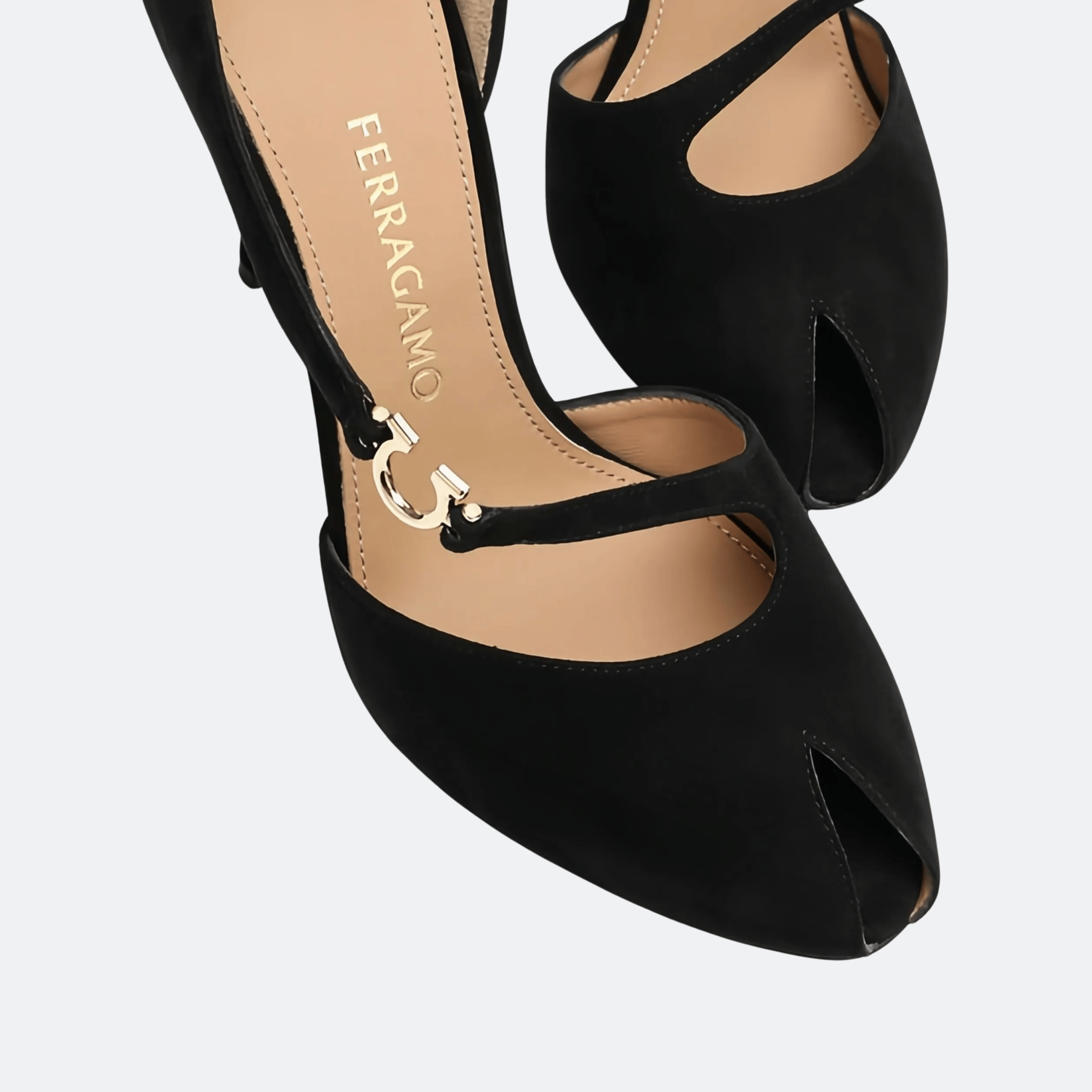 The Ferragamo Molly 95mm Pumps express modern elegance through a sculptural silhouette and signature house detailing. Crafted from luxurious suede, the design features a feminine peep-toe front and a refined high stiletto heel that enhances the leg line with graceful proportions.