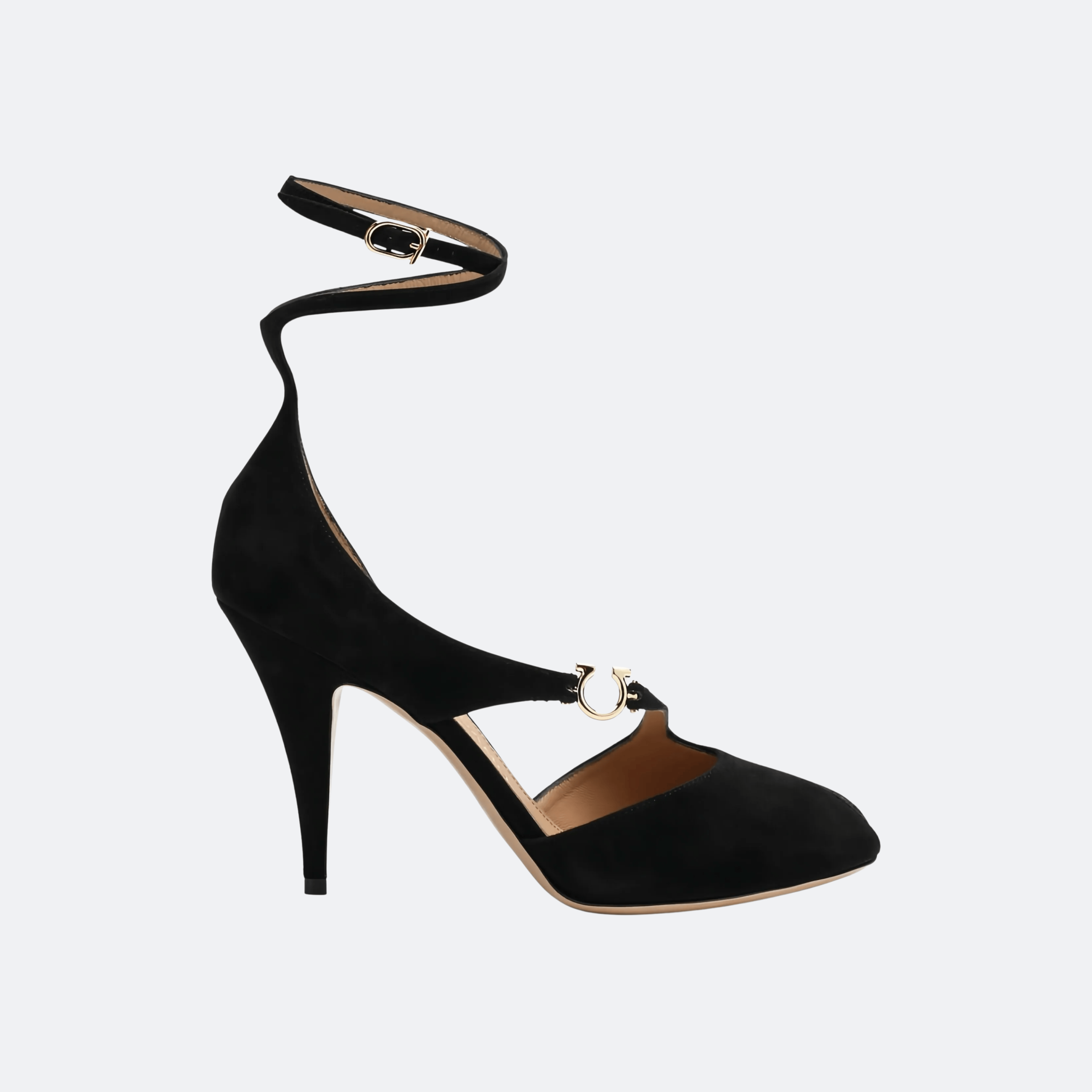 A delicate strap across the vamp is finished with the iconic Gancini hardware in polished gold tone, creating a distinctive Ferragamo signature. The elegant ankle strap with adjustable buckle adds support while highlighting the ankle, giving the shoe a sophisticated evening-ready profile.