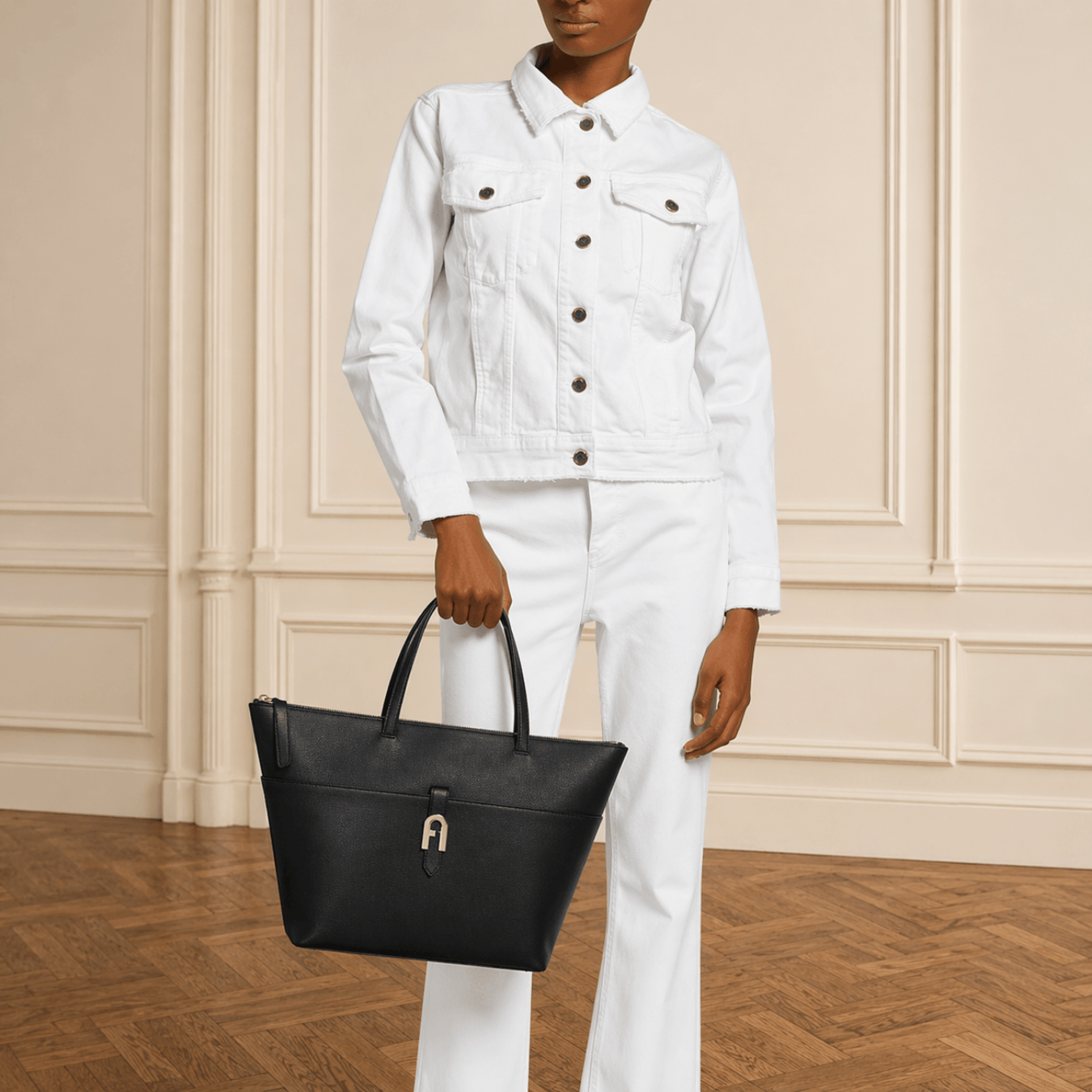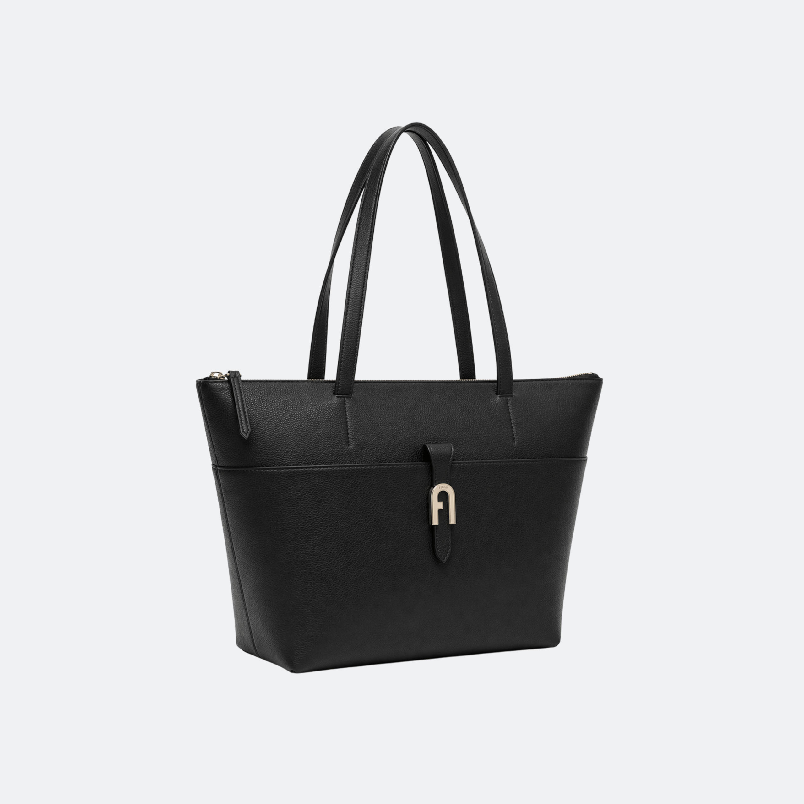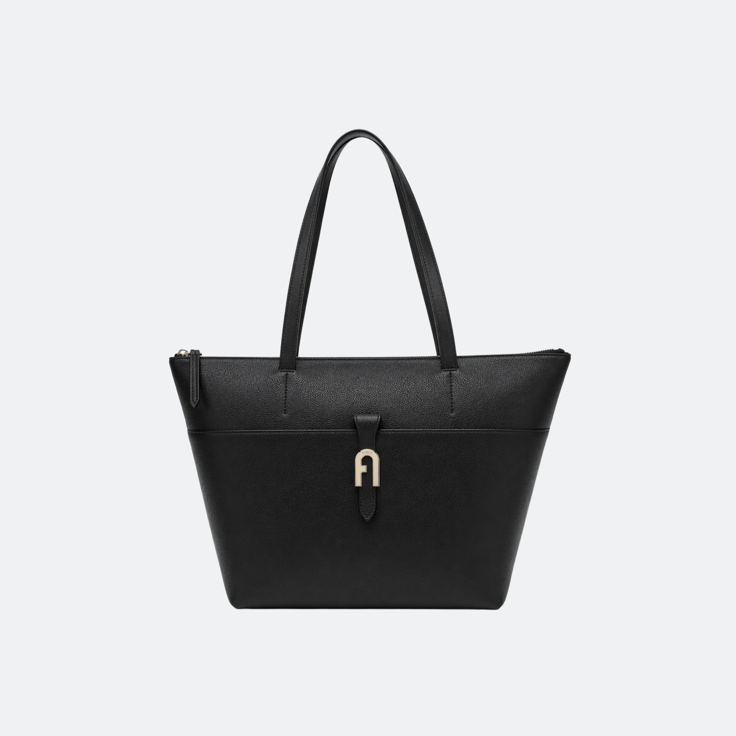 A refined everyday essential, this Furla tote bag is crafted from high-quality grained leather in black. Its structured silhouette offers both elegance and practicality, featuring a spacious interior for daily essentials and sleek top handles for comfortable carry. The minimalist design is elevated with subtle gold-tone hardware and Furla’s signature front detail, making it perfect for both work and sophisticated casual styling.