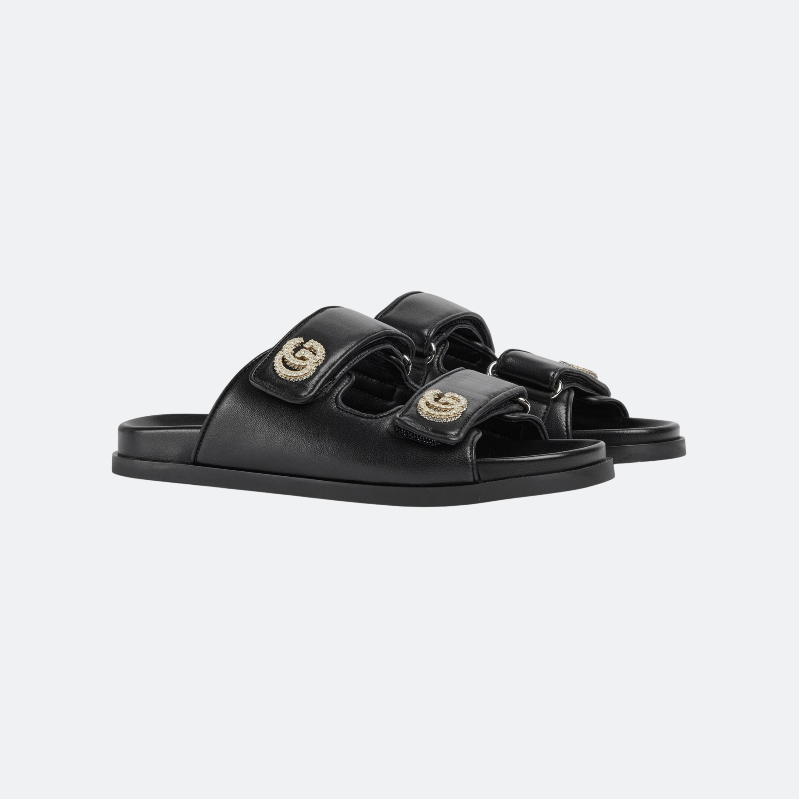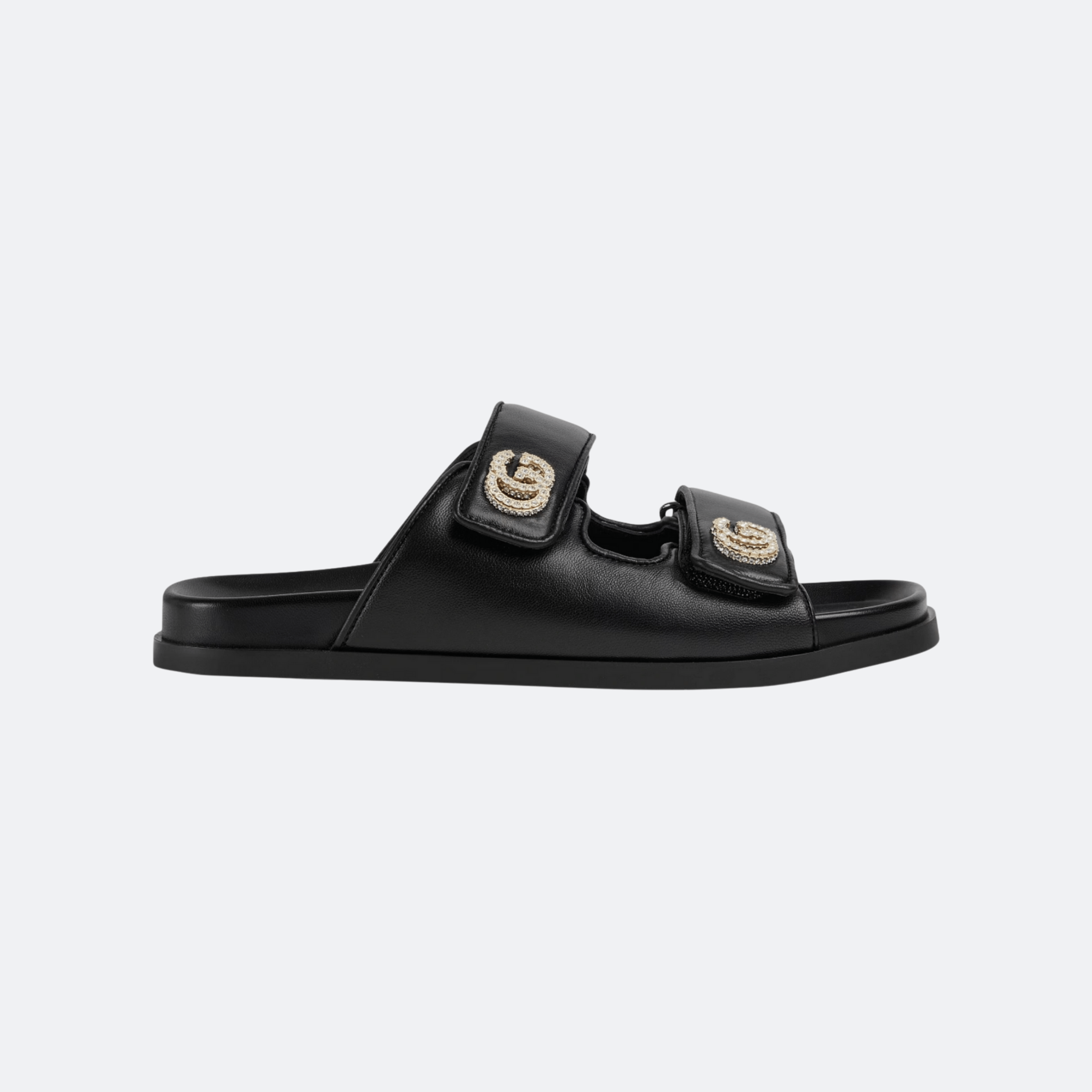 A refined interpretation of a classic slide sandal, this Gucci design is crafted from smooth black leather and finished with crystal-embellished Double G hardware. The padded straps and minimal flat sole create a balance of comfort and elegance, making this style ideal for elevated everyday wear and relaxed luxury looks.