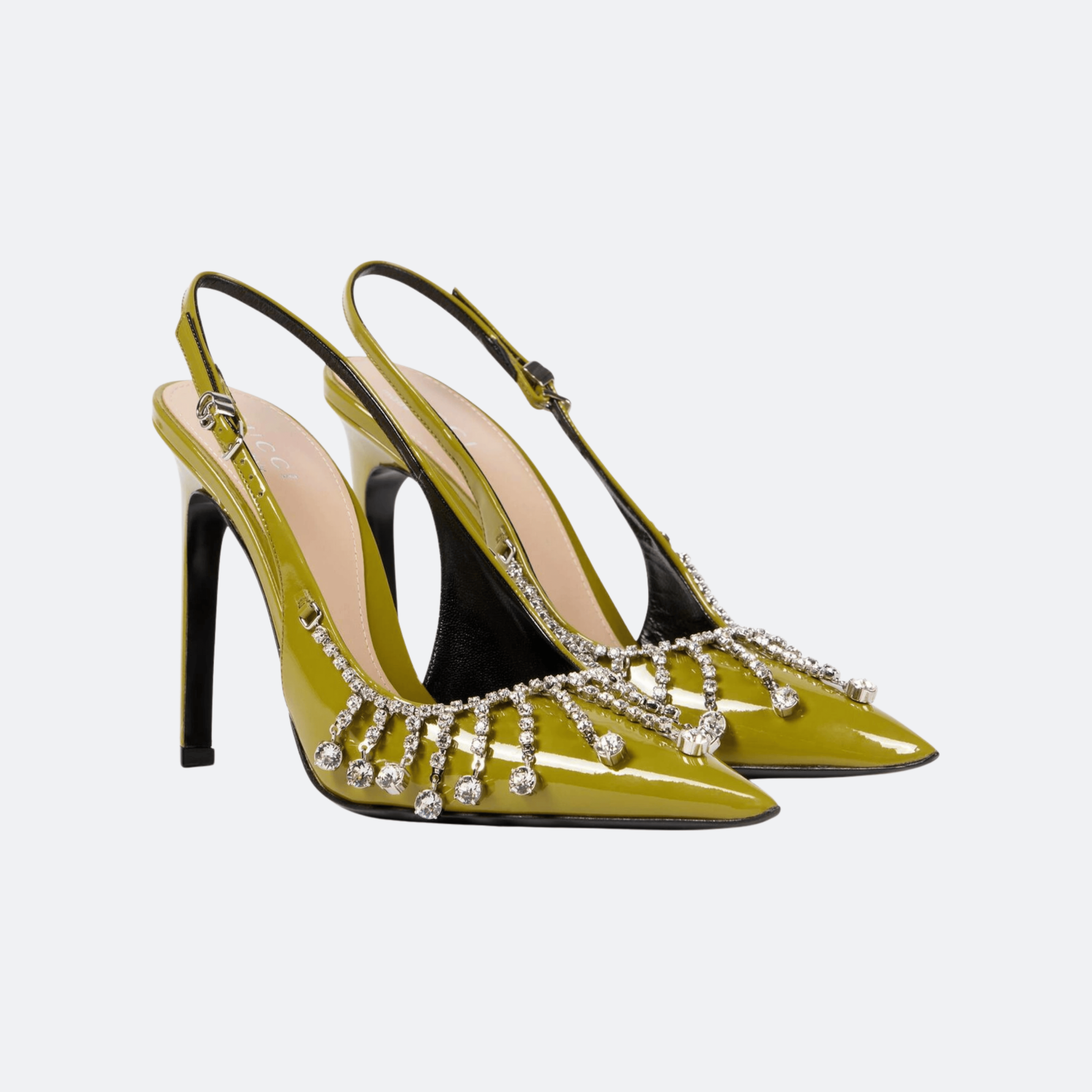 A bold reinterpretation of classic elegance, these Gucci slingback pumps stand out with their high-gloss olive green patent leather and cascading crystal embellishments. The sharply sculpted pointed toe and delicate slingback strap create a refined silhouette, while the shimmering crystal fringe adds movement and light with every step. A statement piece designed for elevated evening looks and high-fashion styling.