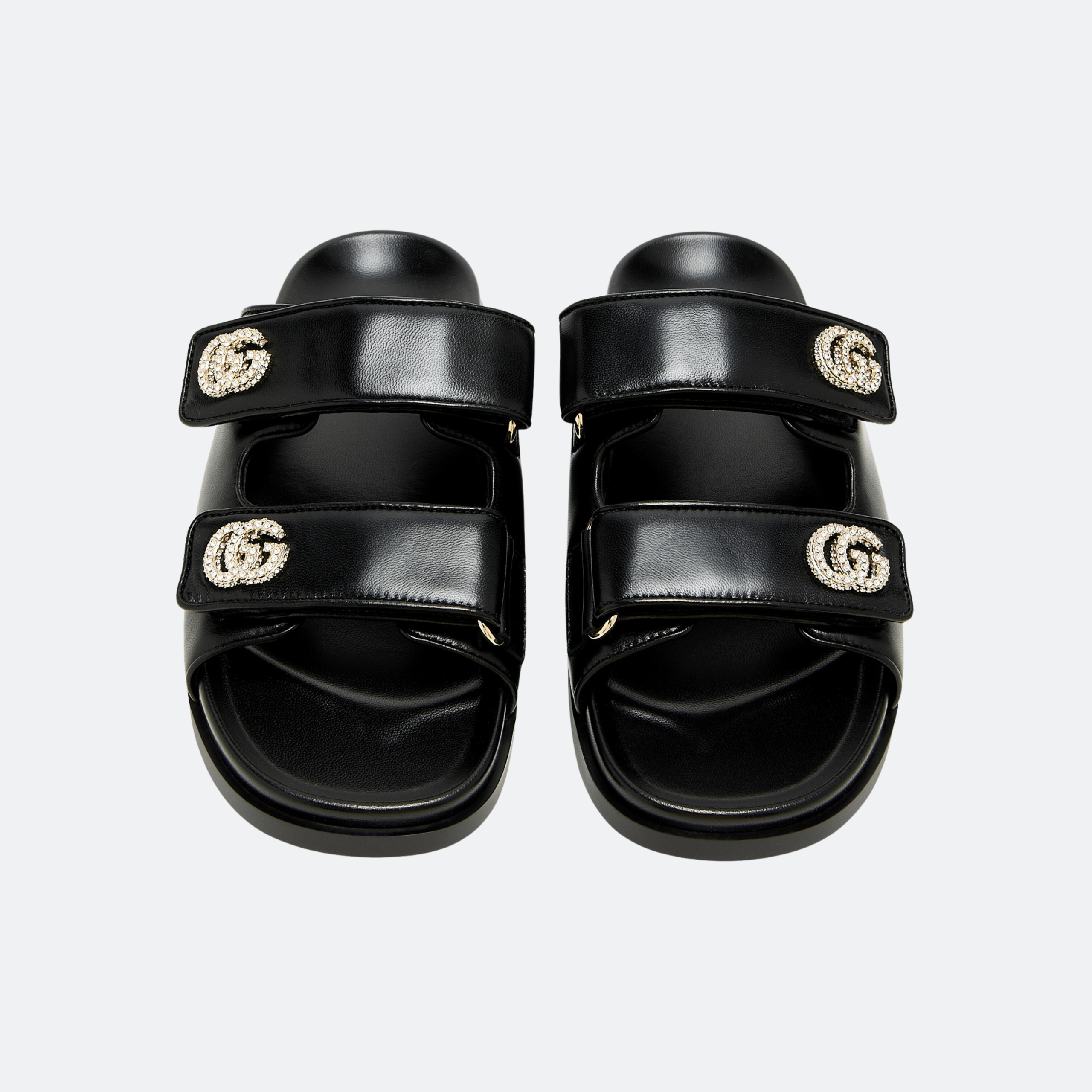 Effortlessly refined, this Gucci slide sandal blends minimalist design with signature house detailing. Crafted from smooth leather, the clean silhouette is elevated by sparkling GG logo embellishments, offering a subtle yet unmistakable statement. Designed for elevated everyday wear, the cushioned footbed and lightweight sole provide comfort without compromising luxury.