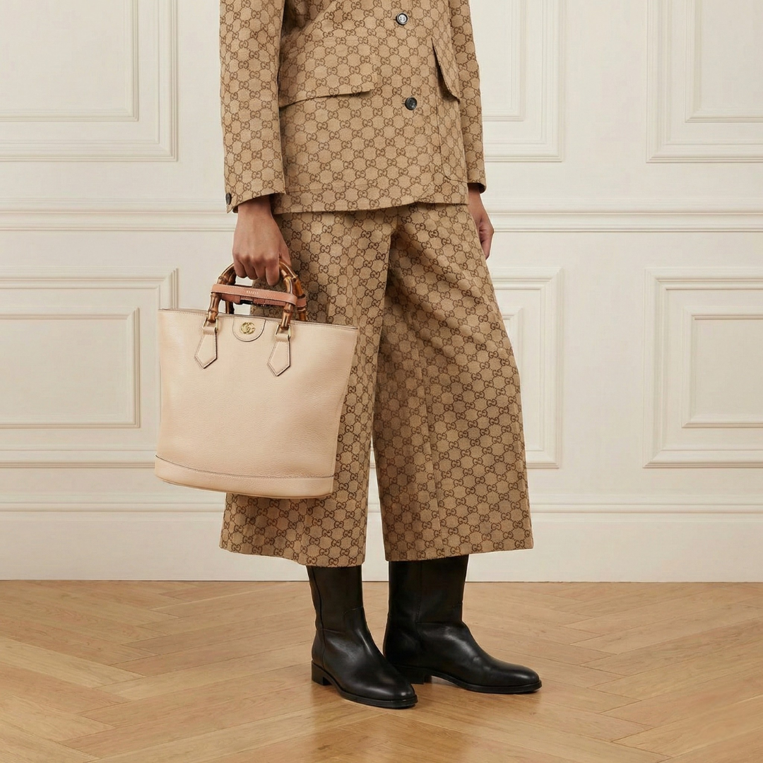 The Gucci Diana Small tote revisits a House icon from the 1990s, distinguished by its signature bamboo handles and structured silhouette. Crafted from smooth leather and accented with gold-tone hardware and a detachable leather strap, this elegant tote balances timeless design with modern functionality, ideal for everyday luxury wear.