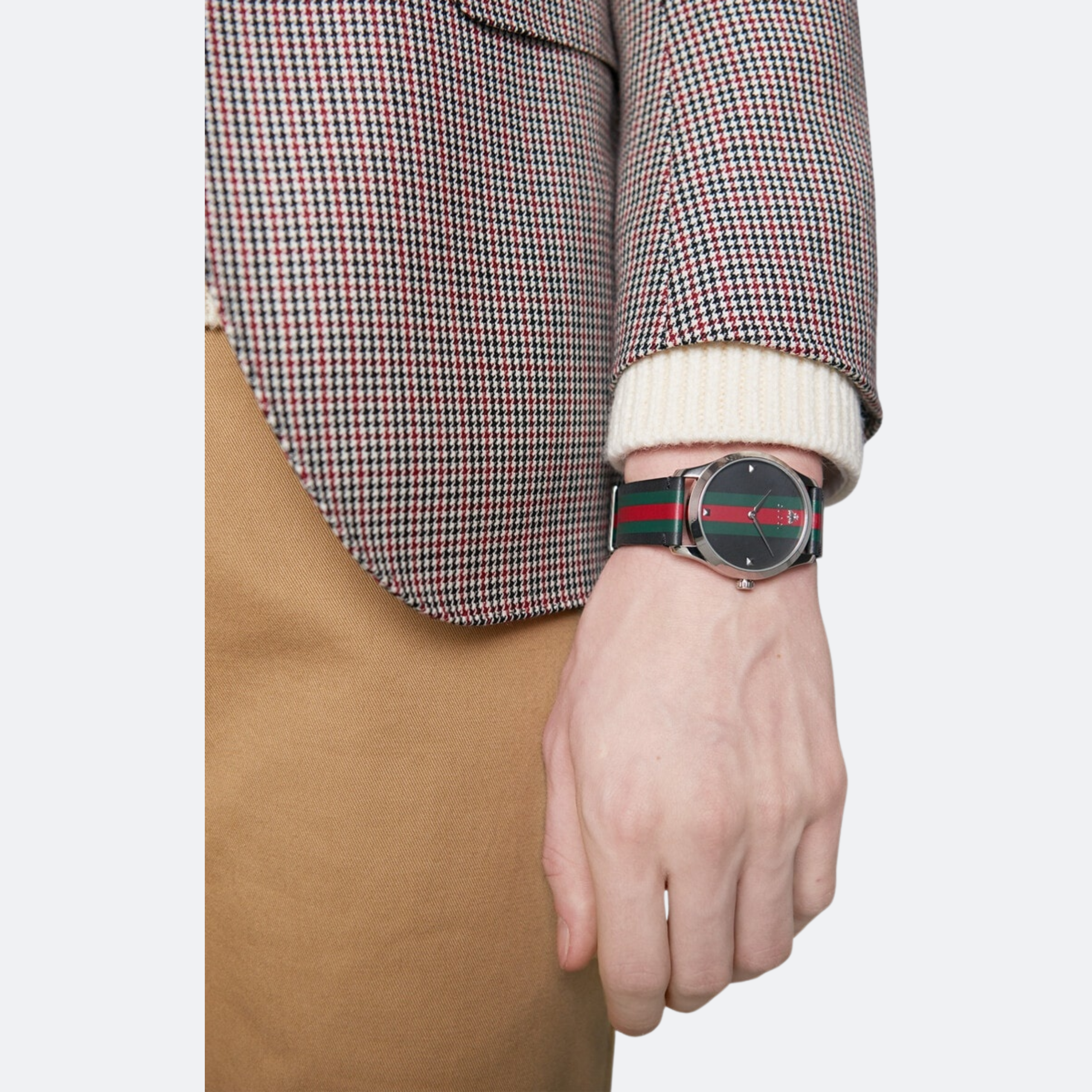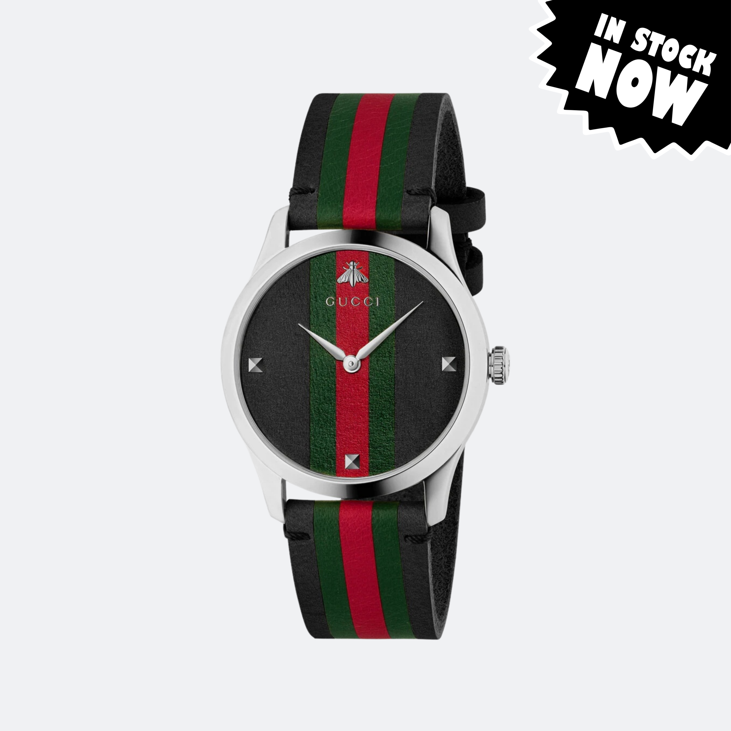 A refined Gucci timepiece featuring a polished stainless-steel case and the iconic green-red Web stripe dial. Finished with an adjustable leather strap in a universal fit, this minimalist design blends Swiss precision with timeless Italian elegance for effortless everyday luxury.
