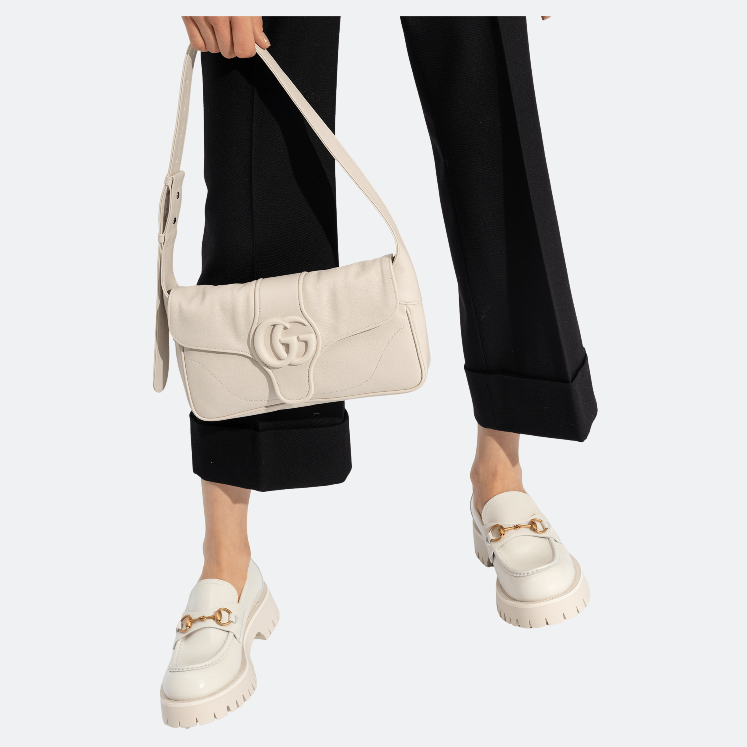 A refined interpretation of the iconic GG Ağhrodite, this small shoulder bag is crafted from smooth white leather and finished with a tonal Interlocking GG logo for a minimalist, contemporary look. Featuring soft curved lines and an adjustable shoulder strap, it offers understated elegance suitable for both day and evening wear.
