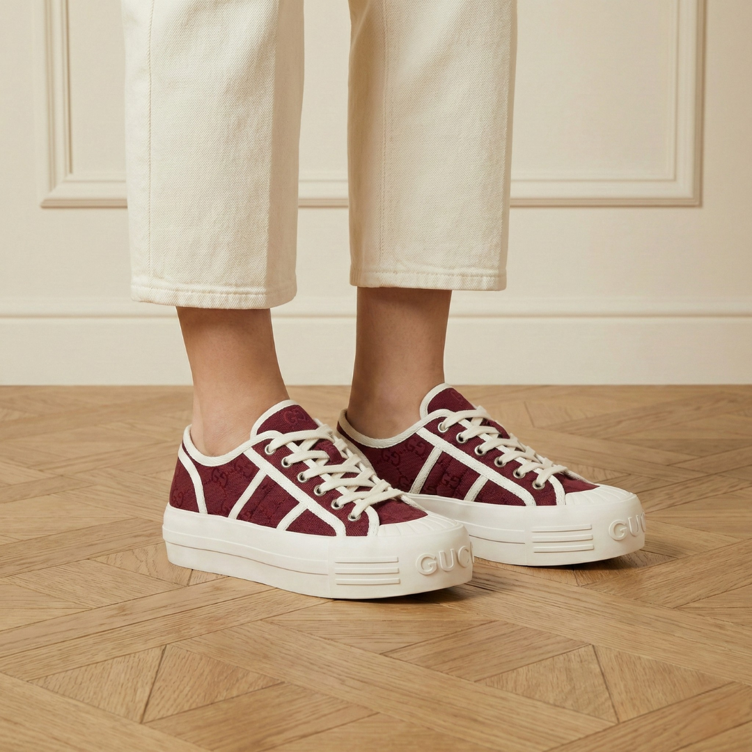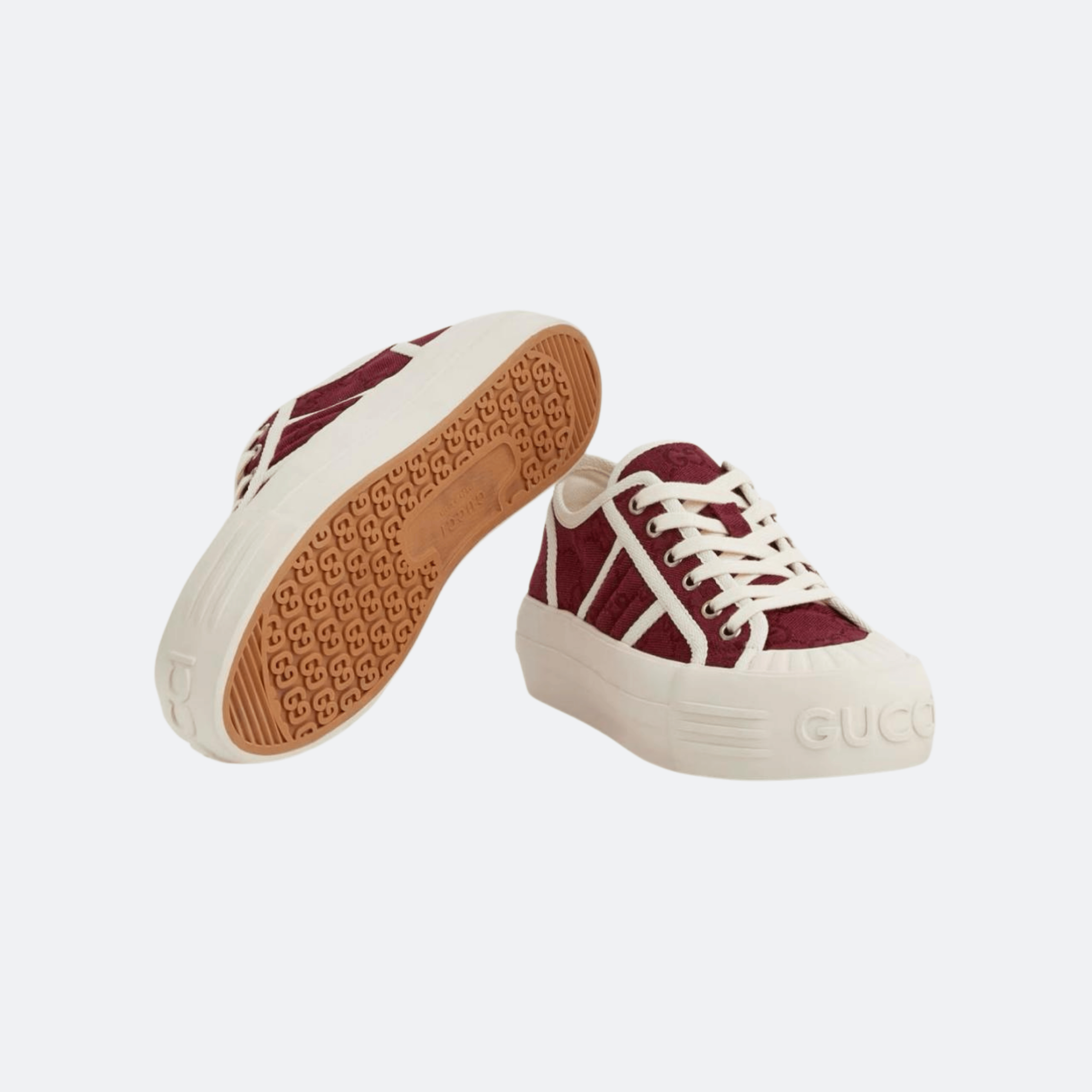 A modern reinterpretation of a classic low-top sneaker, this Gucci platform style is crafted from signature GG canvas in a rich burgundy tone. Set on a bold rubber platform sole, the design balances vintage inspiration with contemporary attitude, offering elevated everyday wear with unmistakable Gucci identity.
