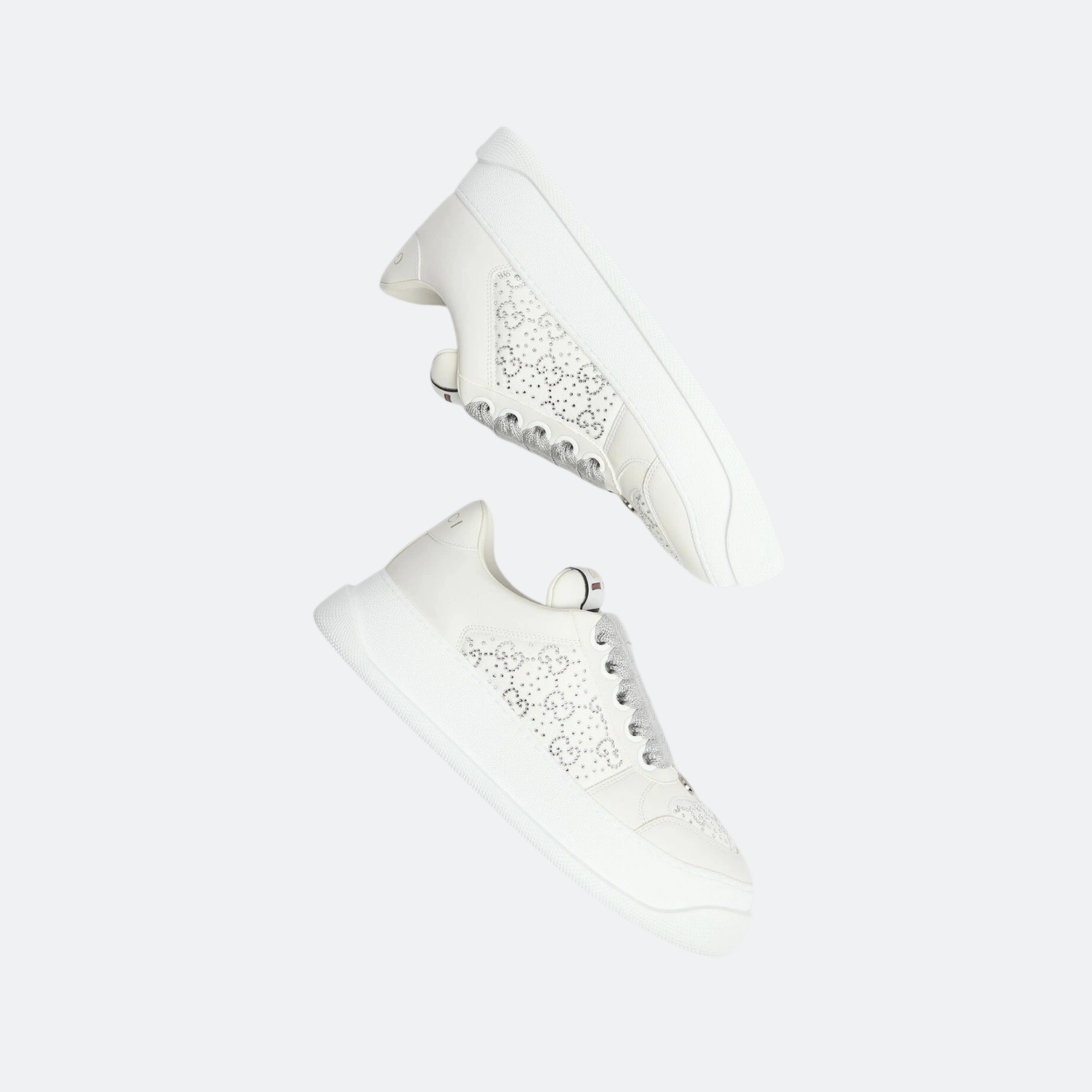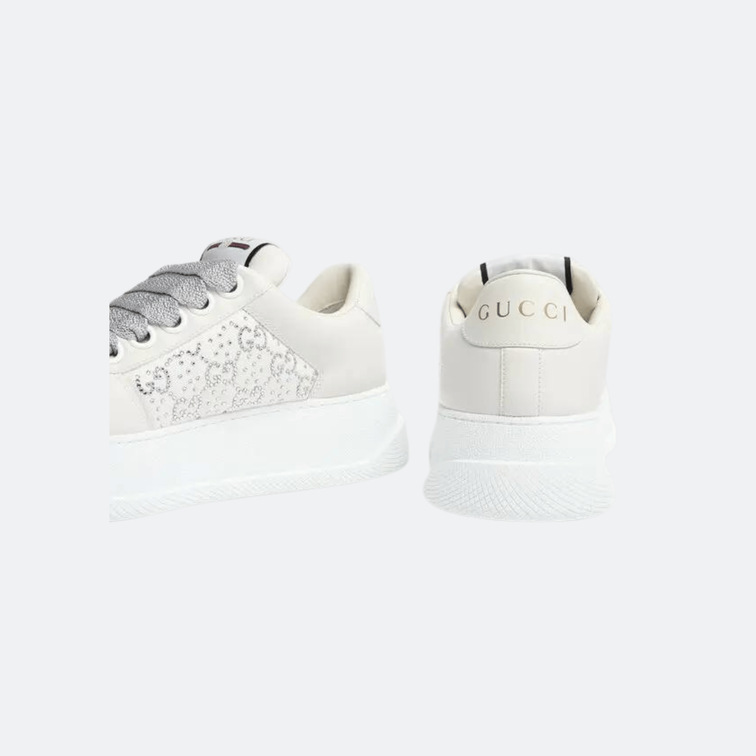 A modern statement piece that blends sporty aesthetics with signature Gucci detailing. This low-top sneaker features a sleek silhouette enriched by the iconic GG motif and shimmering embellishments, creating a balance between casual sophistication and elevated luxury. Designed for versatility and comfort, it seamlessly complements both relaxed and contemporary styling.
