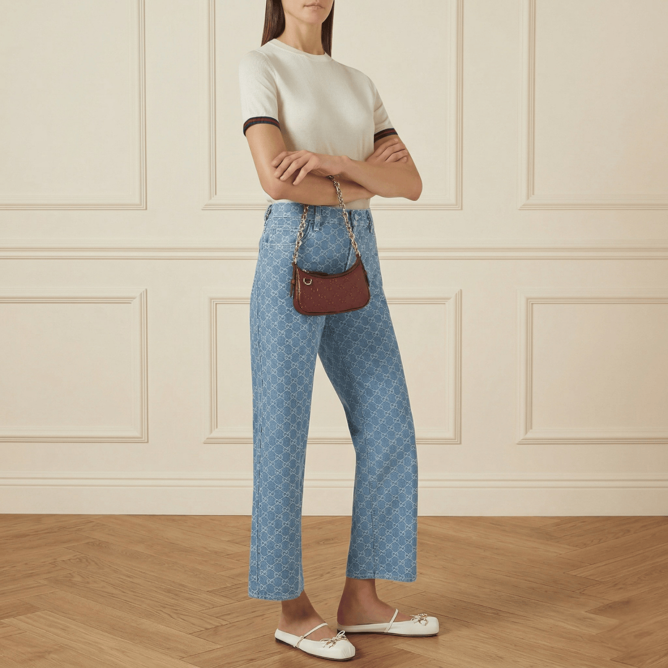 Crafted from embossed leather with the iconic GG motif, this Gucci mini shoulder bag blends heritage detailing with a modern silhouette. Finished with polished gold-tone hardware and a refined chain strap, it offers a compact yet elegant solution for day-to-evening styling.