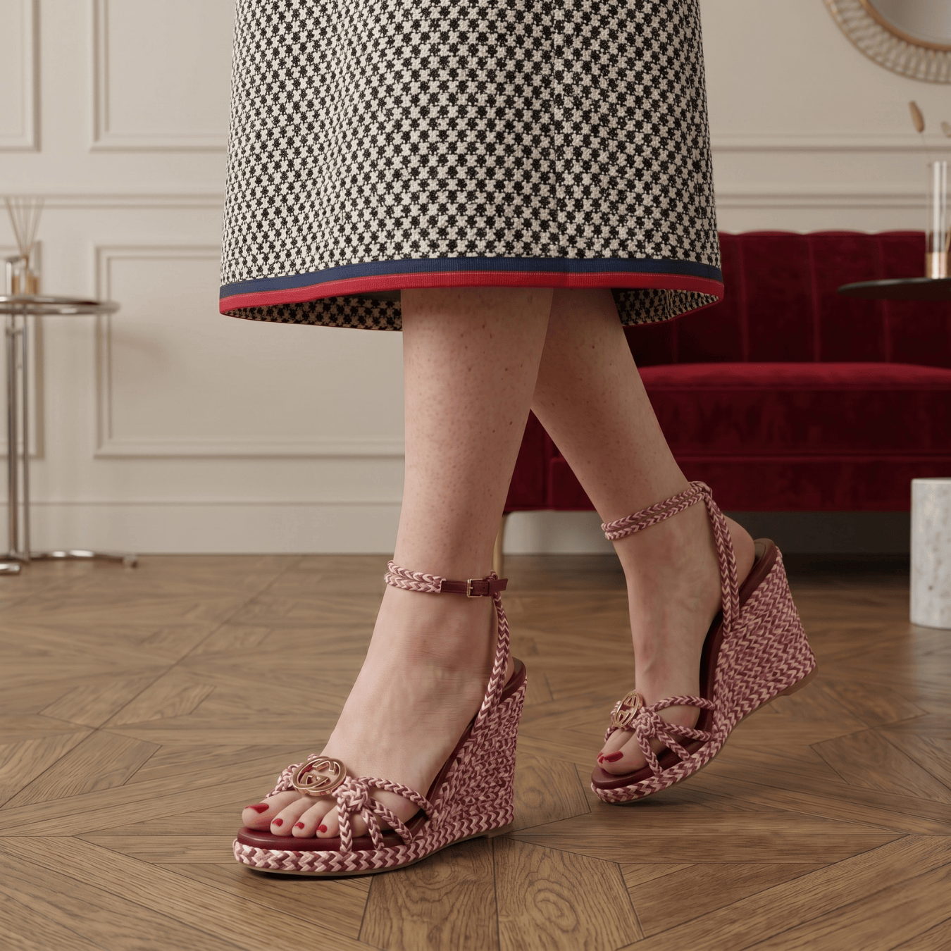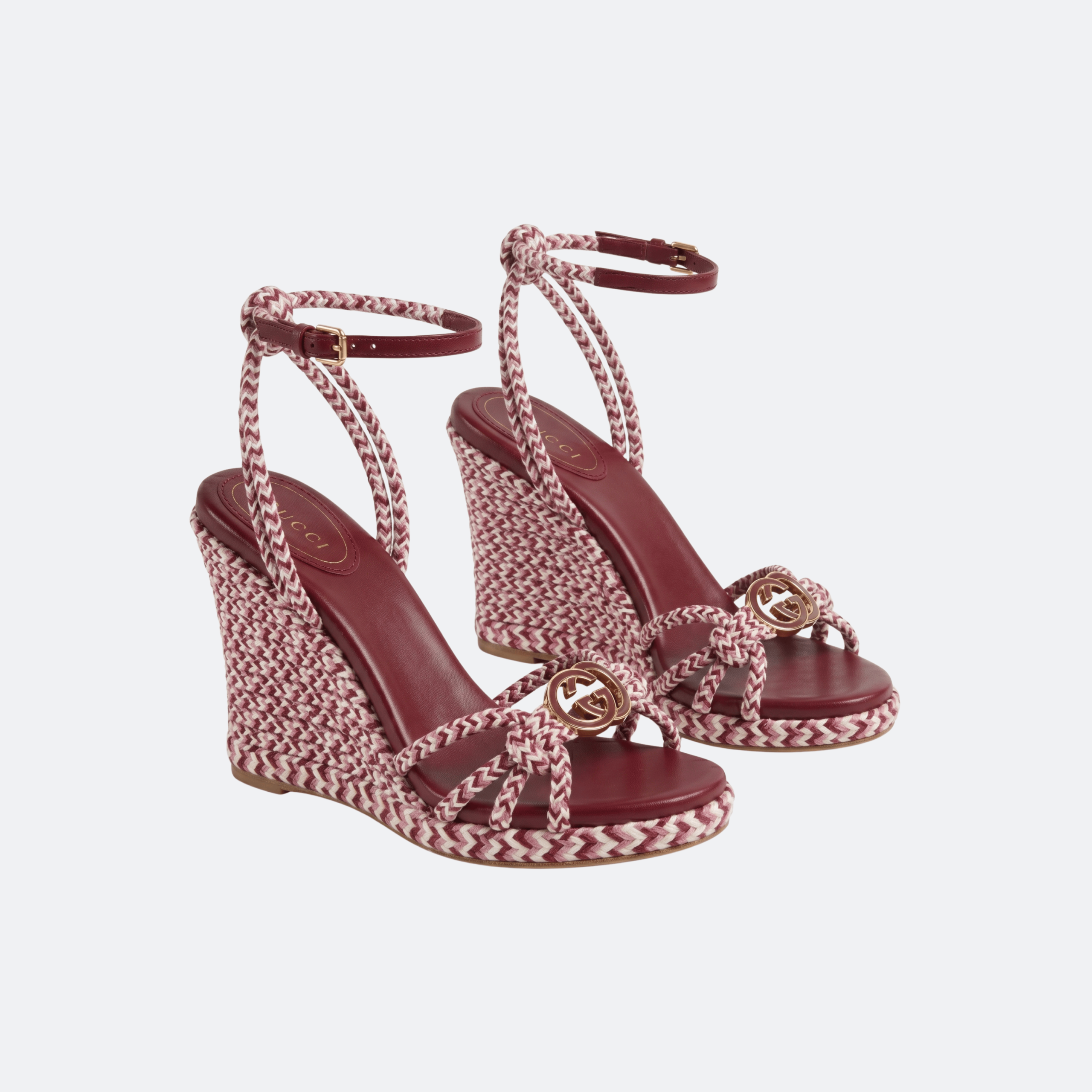 A refined statement sandal featuring a sculpted wedge silhouette wrapped in intricately braided textile. Designed with interwoven rope straps and the iconic gold-tone GG logo, it blends artisanal texture with modern luxury. The burgundy leather footbed adds depth and elegance, making it a standout piece for elevated summer styling.