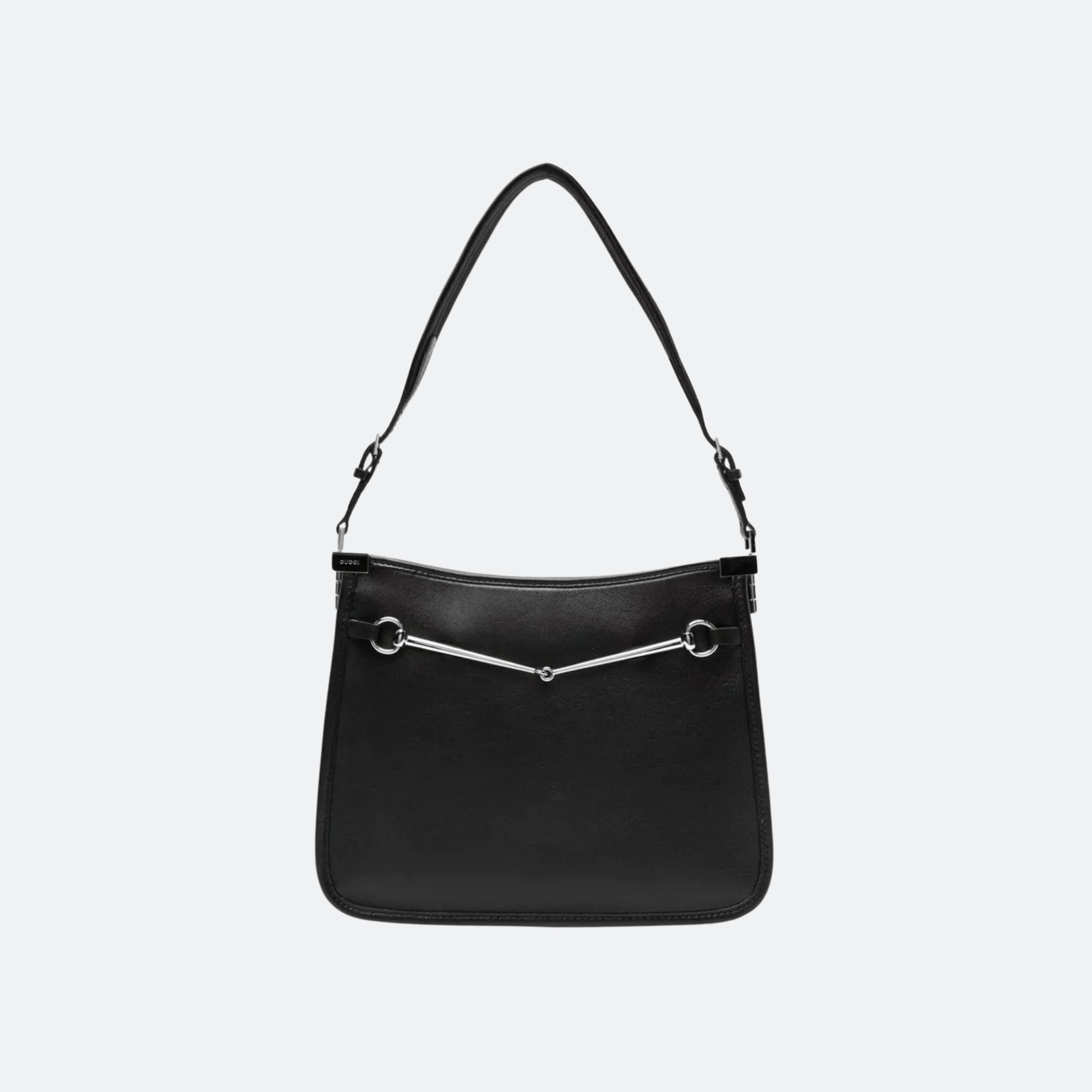 A refined Gucci Horsebit 1955 shoulder bag crafted from smooth black leather, featuring the iconic silver-tone Horsebit detail across the front. Designed with a clean, structured silhouette and adjustable shoulder strap, this timeless piece reflects Gucci’s equestrian heritage with a modern minimalist edge, ideal for everyday or evening wear.