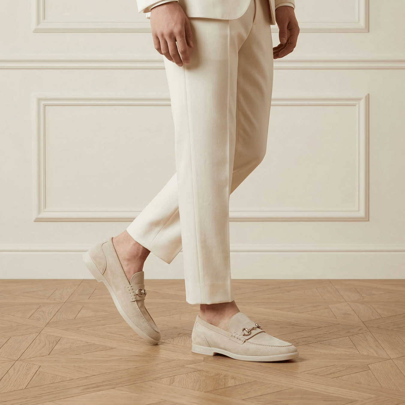A refined expression of Gucci’s heritage design, the Horsebit Suede Loafer blends classic Italian craftsmanship with contemporary comfort. Crafted from soft cream-beige suede, the silhouette maintains a clean and elegant profile while showcasing the iconic silver-tone Horsebit hardware across the vamp — a signature Gucci motif inspired by equestrian tradition.