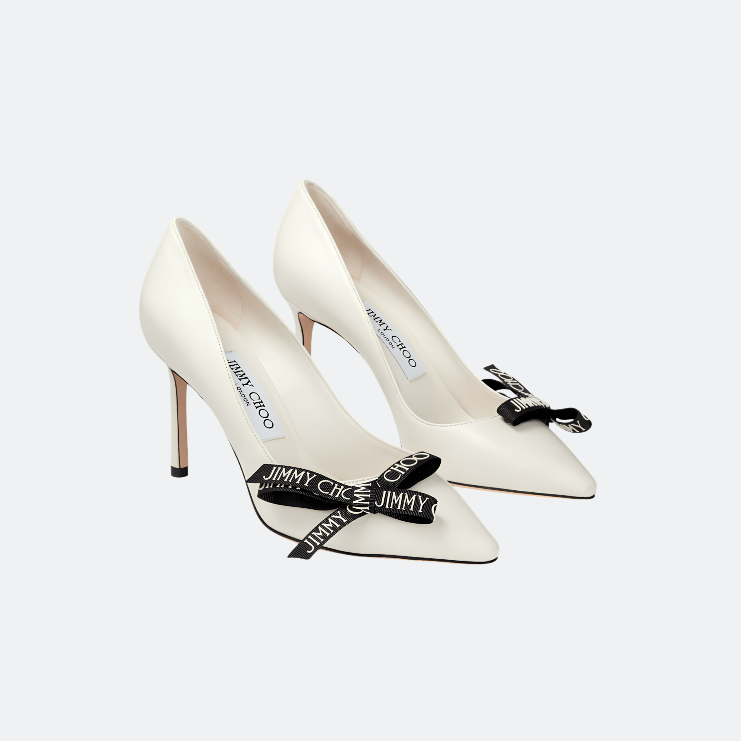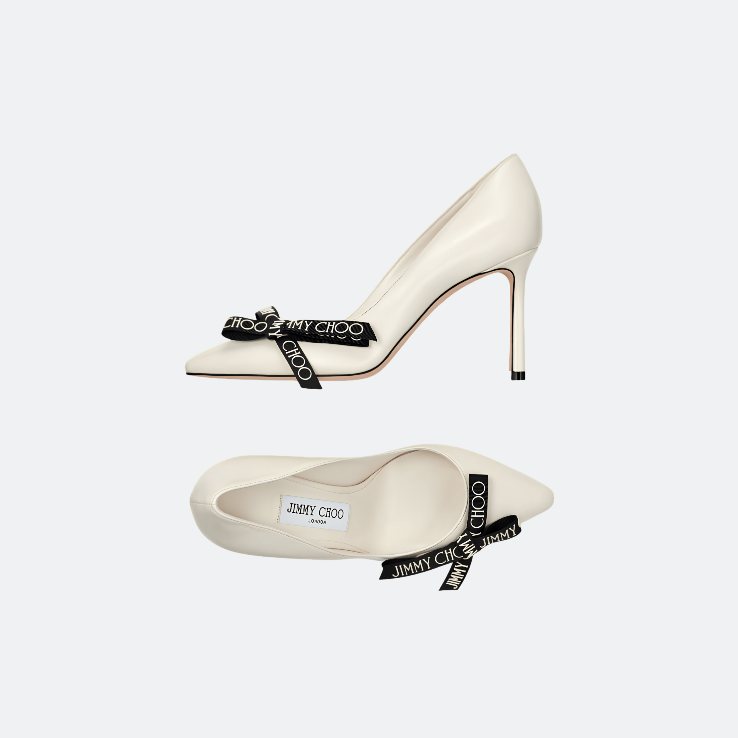 Elegant and feminine, the Dover 85 mm Leather Pumps by Jimmy Choo are crafted from smooth ivory leather and finished with a signature logo-printed bow at the pointed toe. Set on a refined mid-height stiletto heel, they offer a perfect balance of sophistication and modern charm—ideal for both formal occasions and elevated everyday wear.