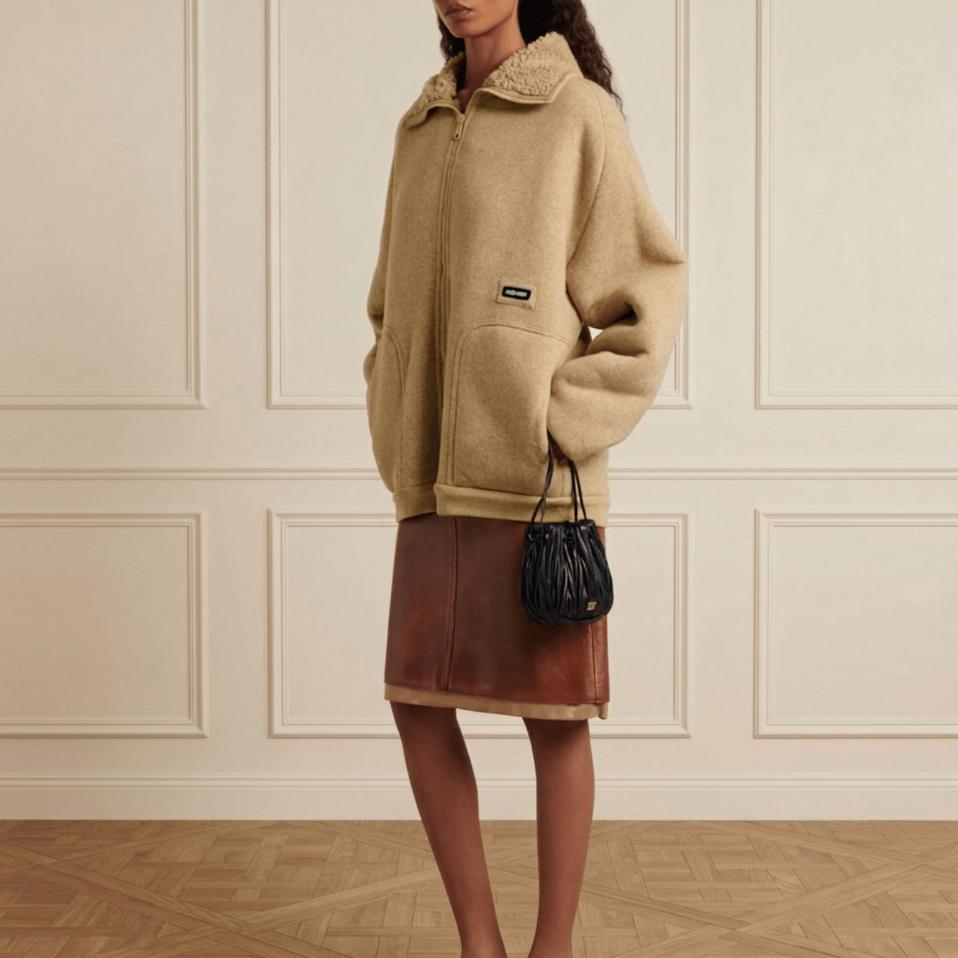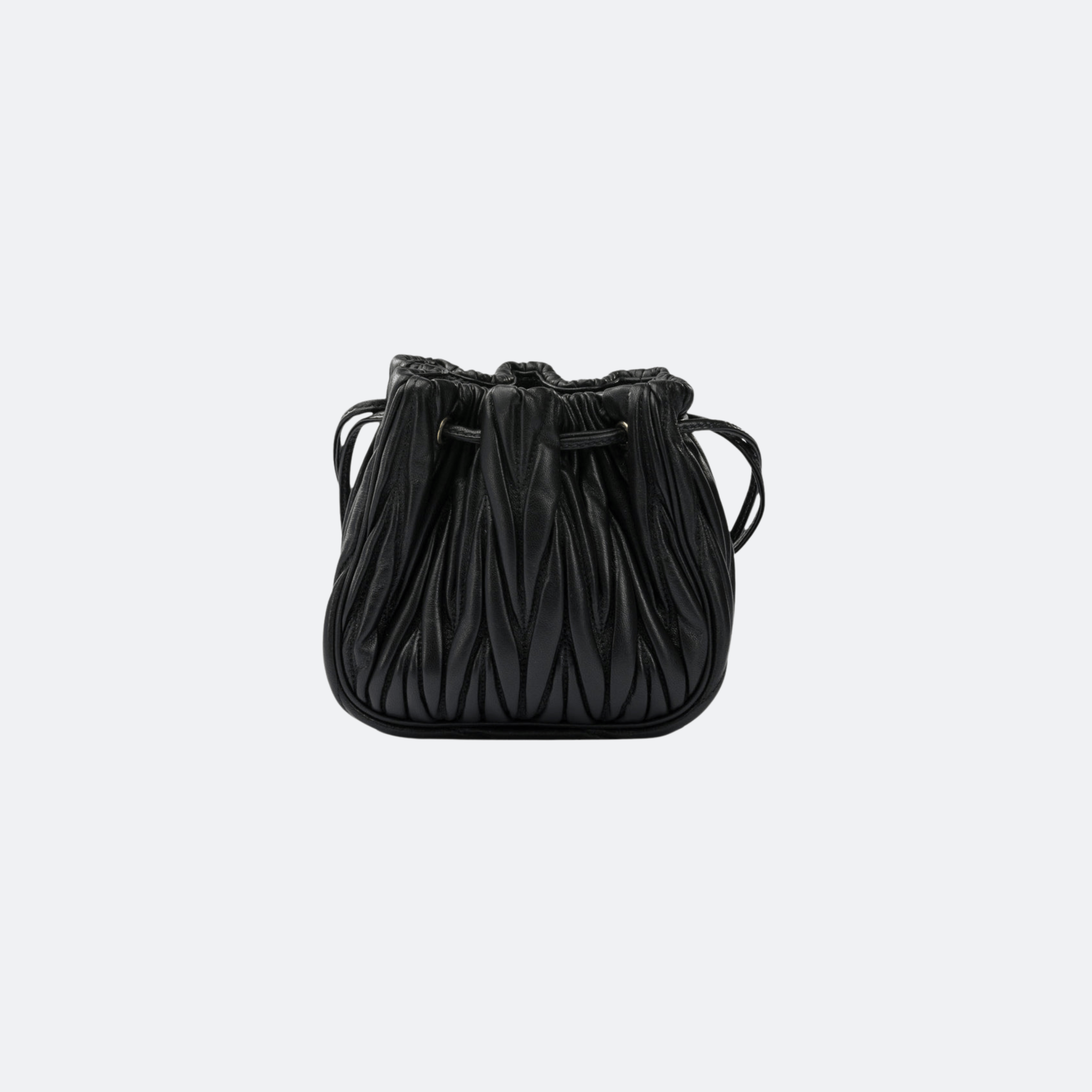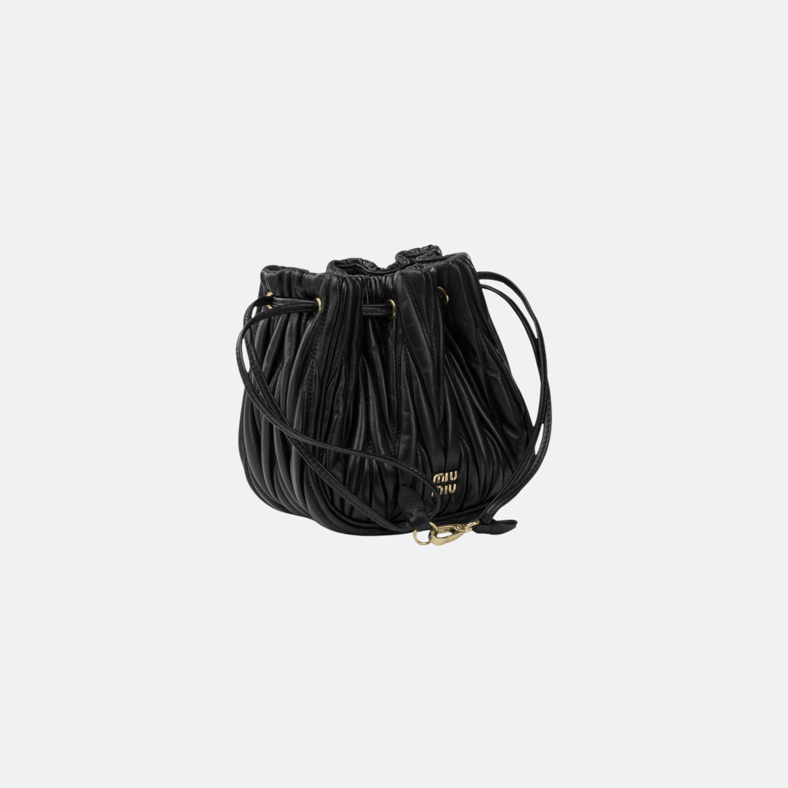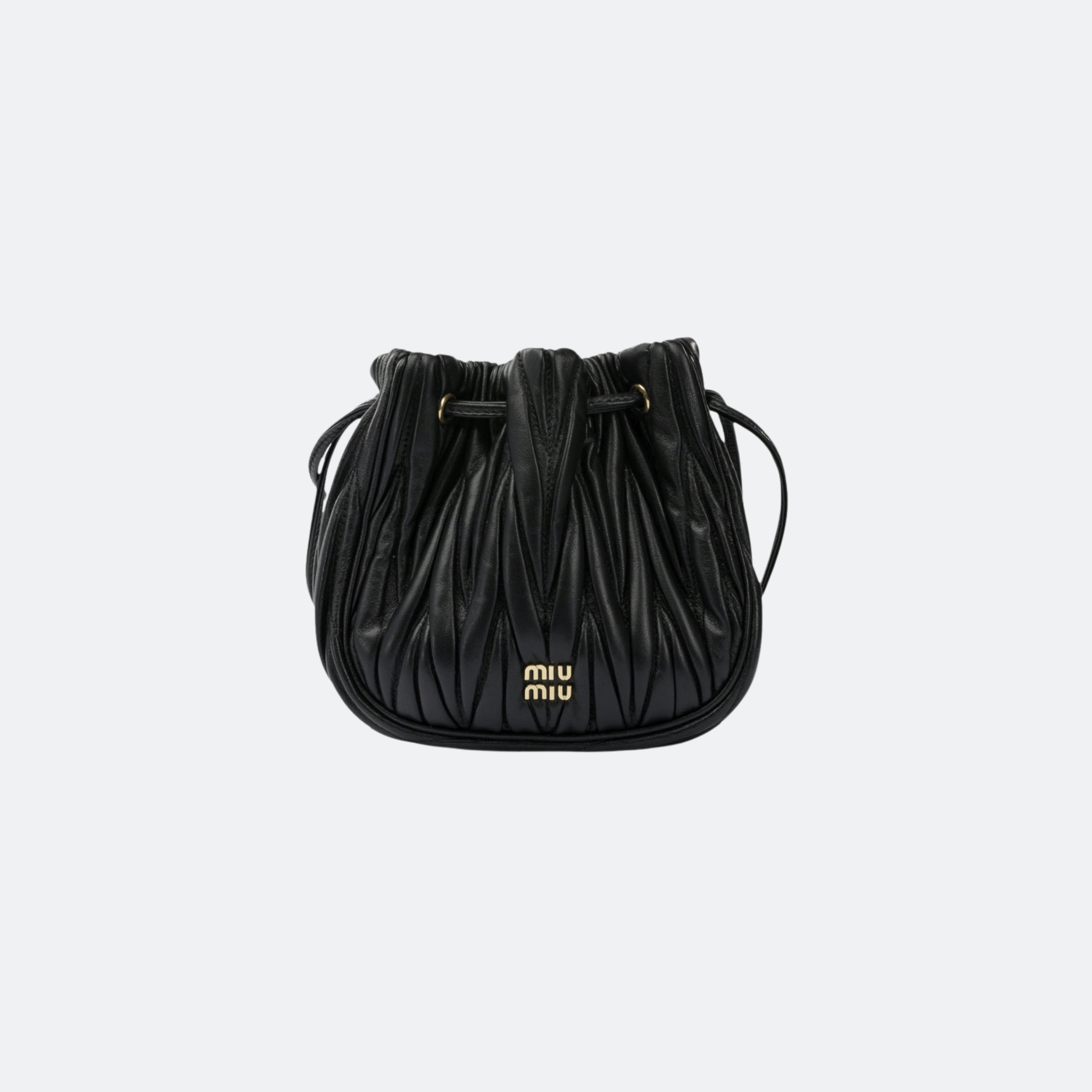Crafted from supple nappa leather, this Miu Miu matelassé bag features the brand’s signature gathered quilting that creates a soft, dimensional texture. Designed with a drawstring closure and compact silhouette, it offers both elegance and practicality, while the gold-tone logo adds a refined luxury touch—perfect for elevating everyday and evening looks.