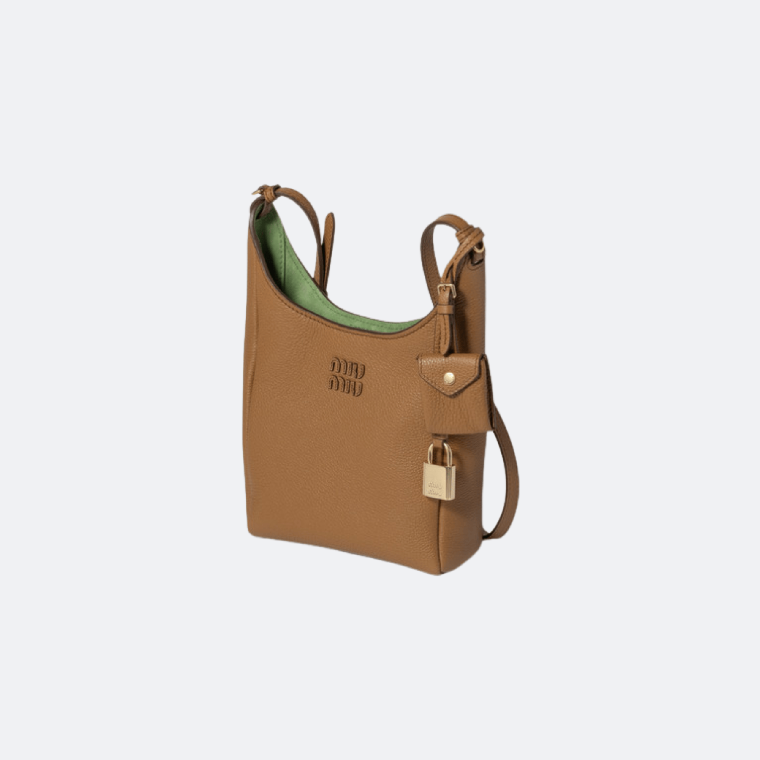 Crafted from textured grained leather, this Miu Miu small bucket bag features a structured yet soft silhouette with an embossed logo, adjustable strap, and signature lock detail. The rich caramel tone paired with a contrasting interior adds a refined yet contemporary touch, making it a versatile everyday luxury piece.