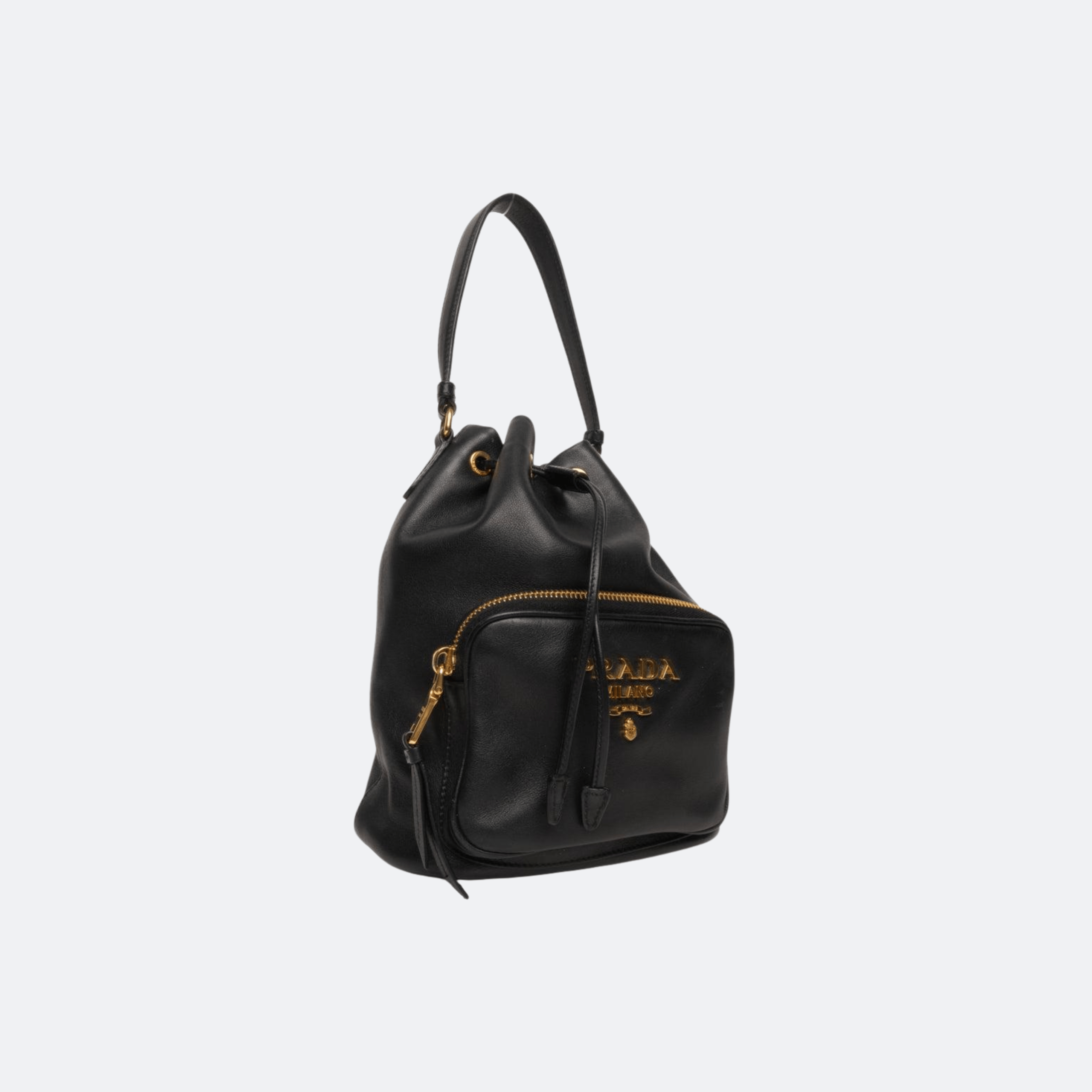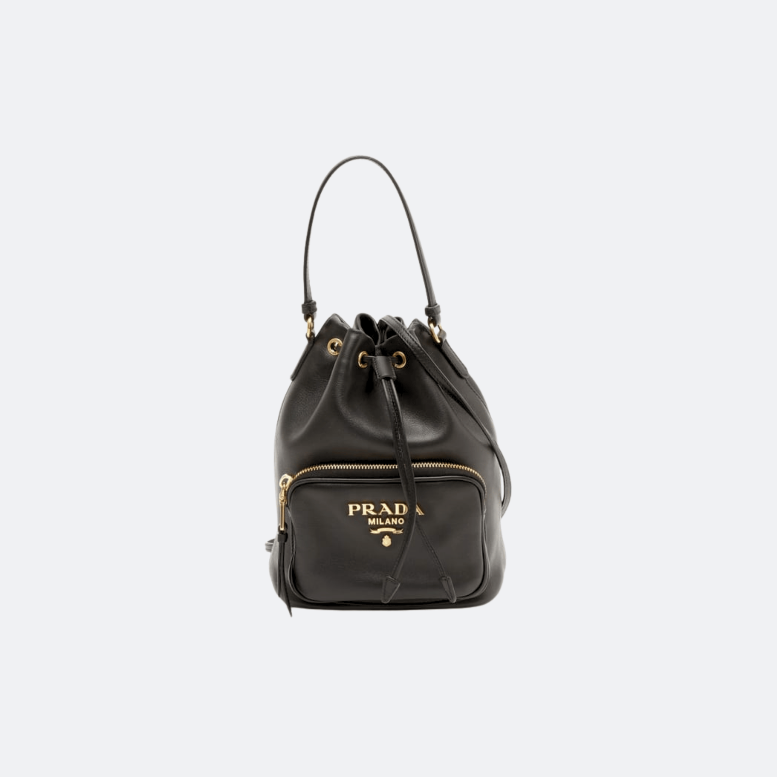 The Prada Duet Leather Bucket Bag is a chic and versatile mini bucket bag crafted in premium smooth leather with a subtle sheen. Featuring a drawstring closure, a convenient front zip pocket, polished gold-tone hardware, and the iconic Prada Milano logo plaque, this bag combines luxury style with everyday functionality. It includes a top handle and a detachable, adjustable shoulder strap for multiple styling options — carry it by hand or wear it as a crossbody.