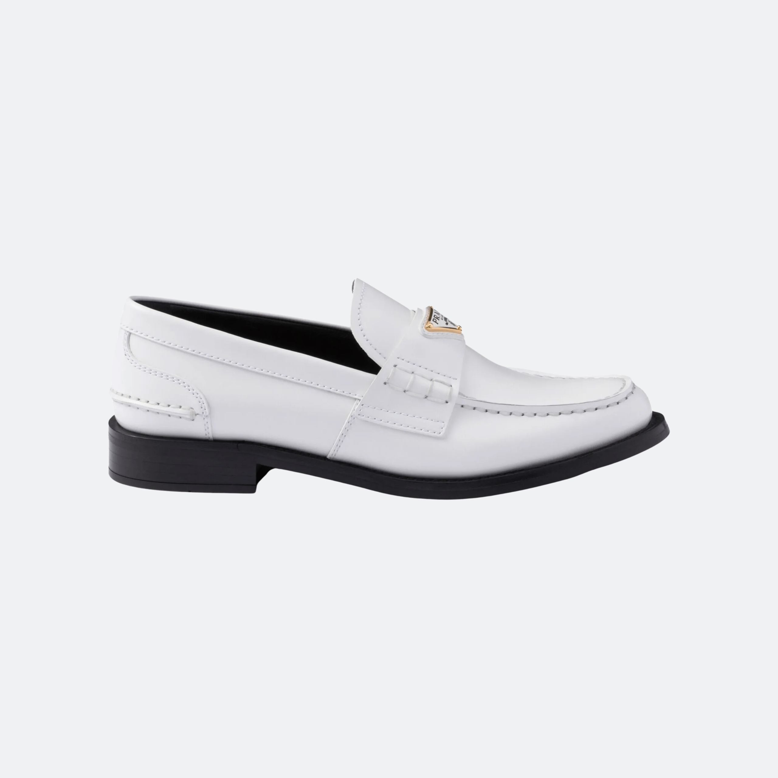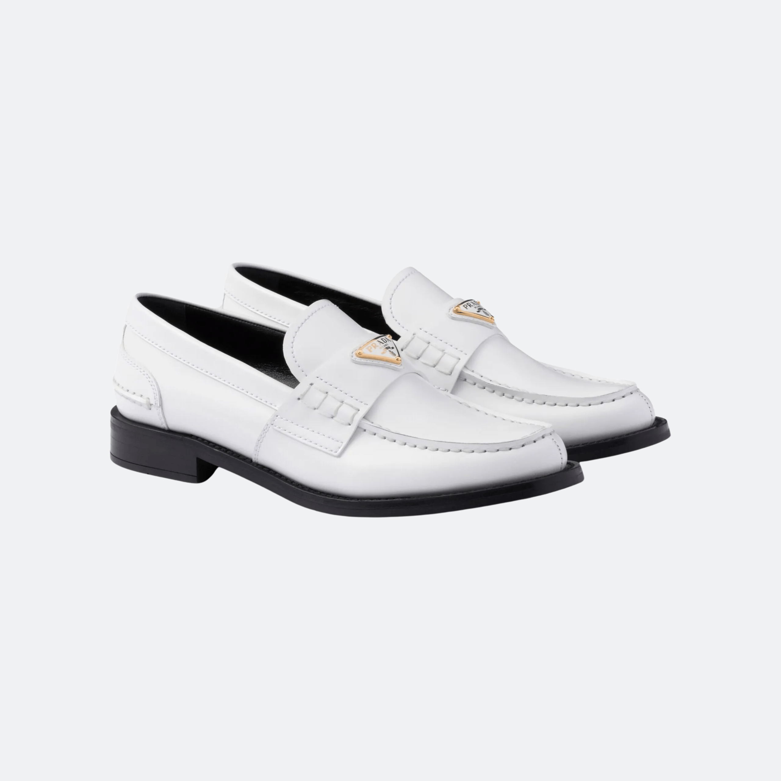 A refined reinterpretation of a timeless classic. These Prada loafers are crafted from smooth white leather and defined by clean lines, precise stitching, and a structured silhouette. The iconic enamelled Prada triangle logo on the vamp adds a signature accent, while the low stacked heel and sleek profile offer understated elegance. A versatile design that transitions effortlessly from tailored looks to modern casual styling.
