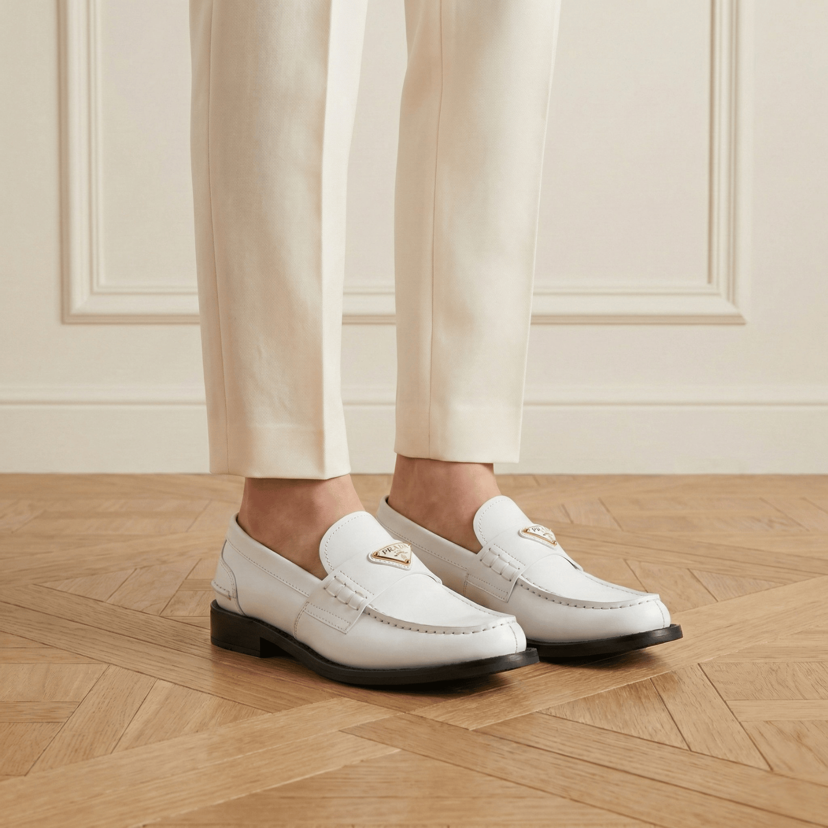 Prada Leather Loafers with Triangle Logo – White (Women)