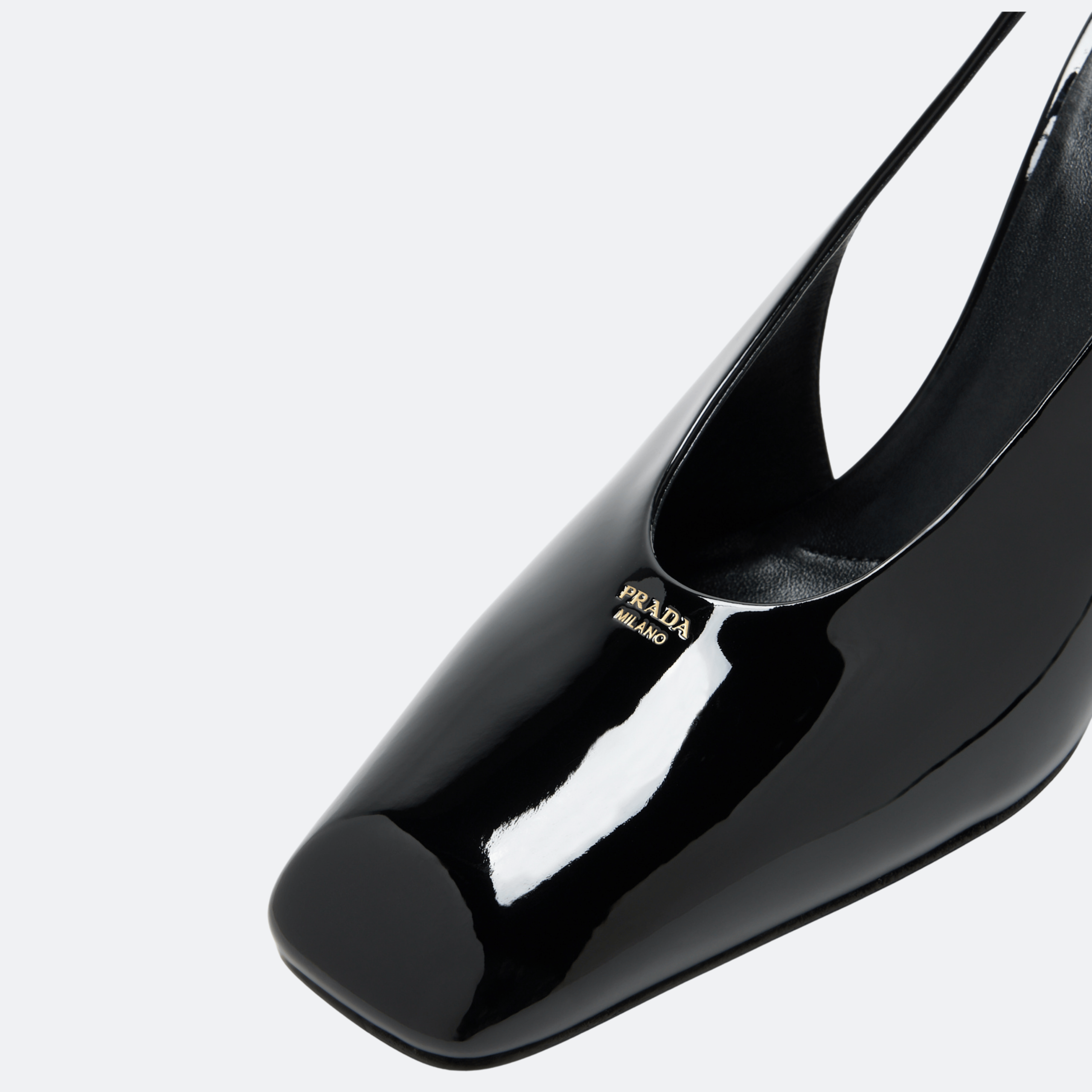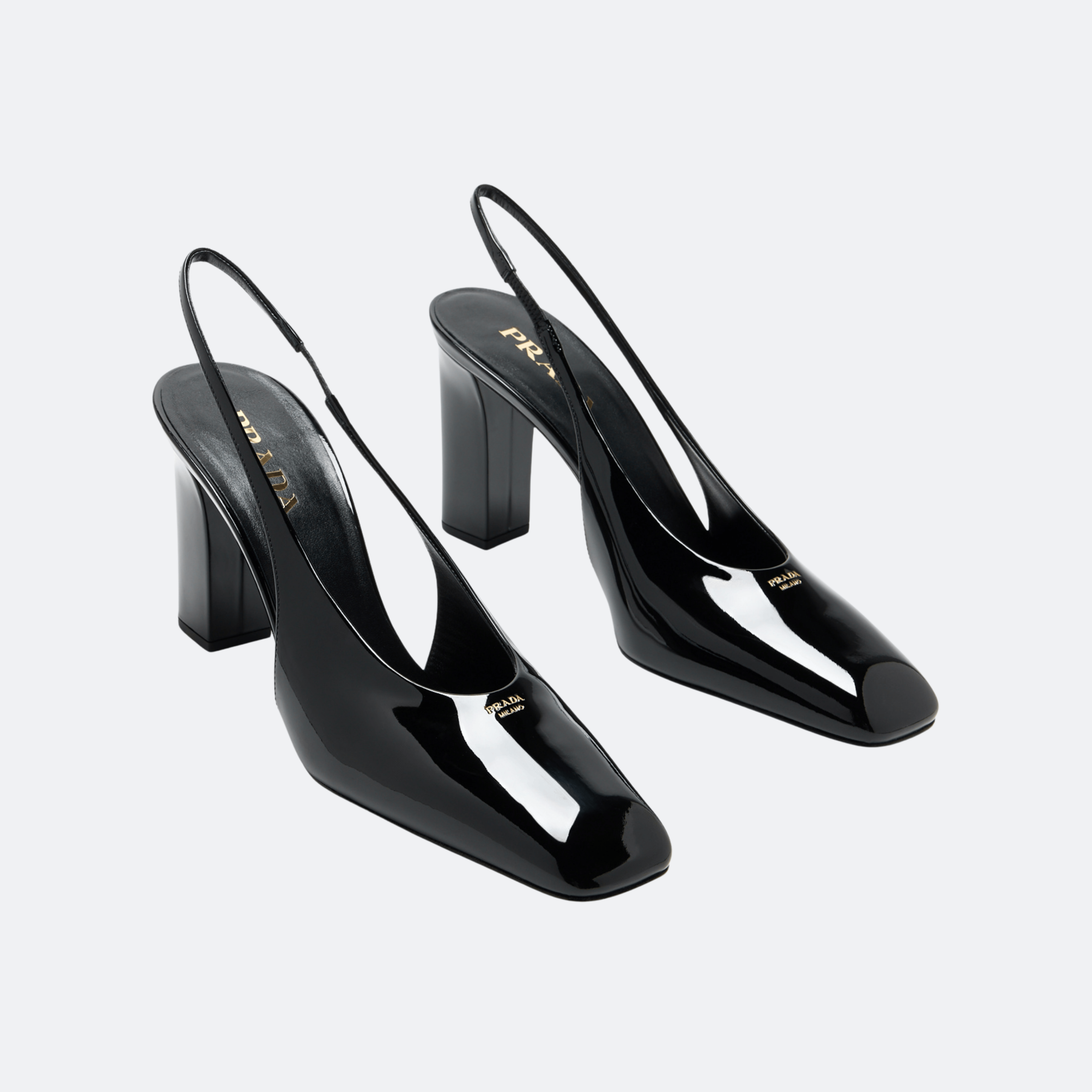 A refined Prada slingback pump crafted in high-gloss patent leather, featuring a modern square toe and a sculptural block heel. The minimalist silhouette balances architectural elegance with confident femininity, making it ideal for evening events and elevated city wear.