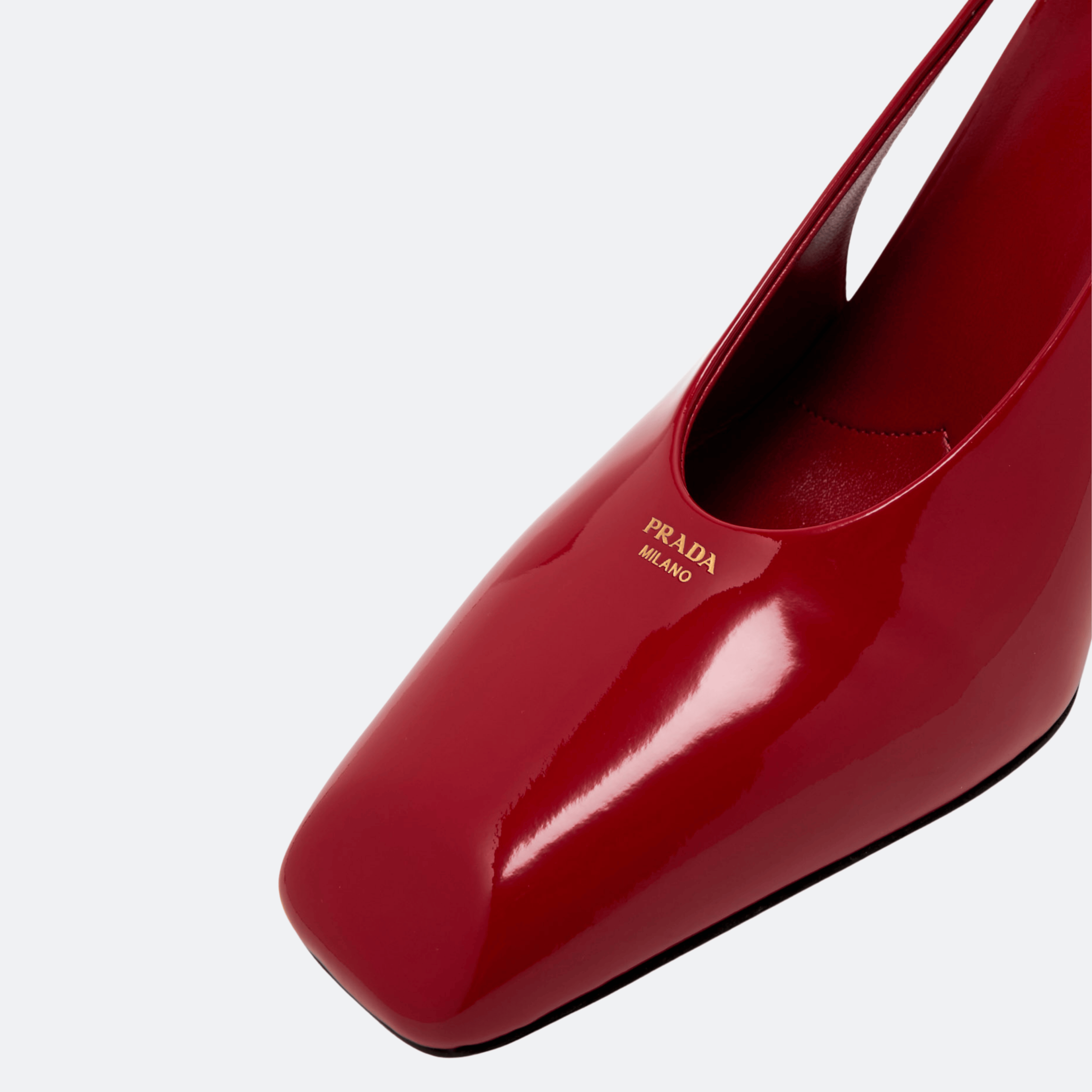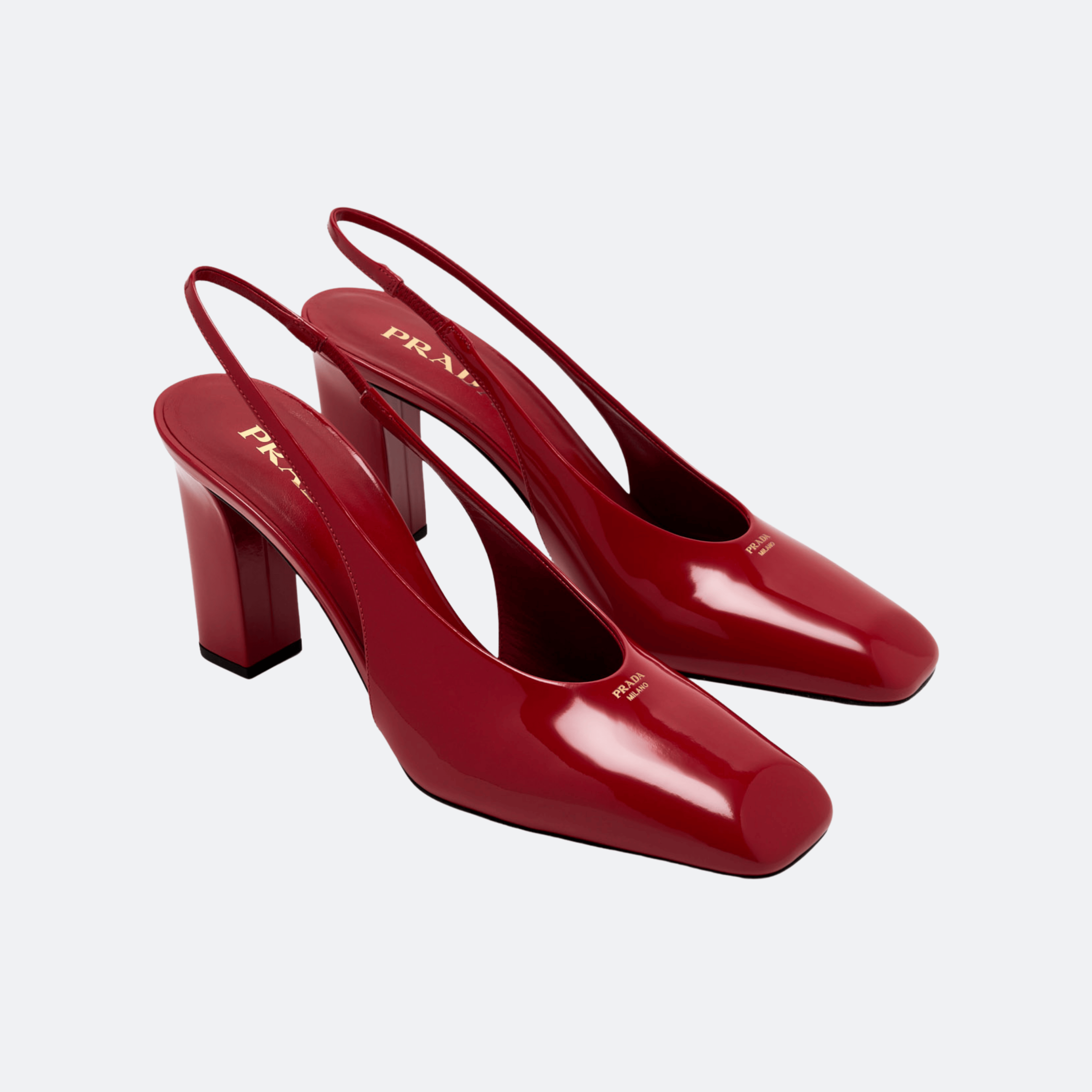 A refined Prada slingback pump crafted in high-gloss patent leather, featuring a modern square toe and a sculptural block heel. The minimalist silhouette balances architectural elegance with confident femininity, making it ideal for evening events and elevated city wear.