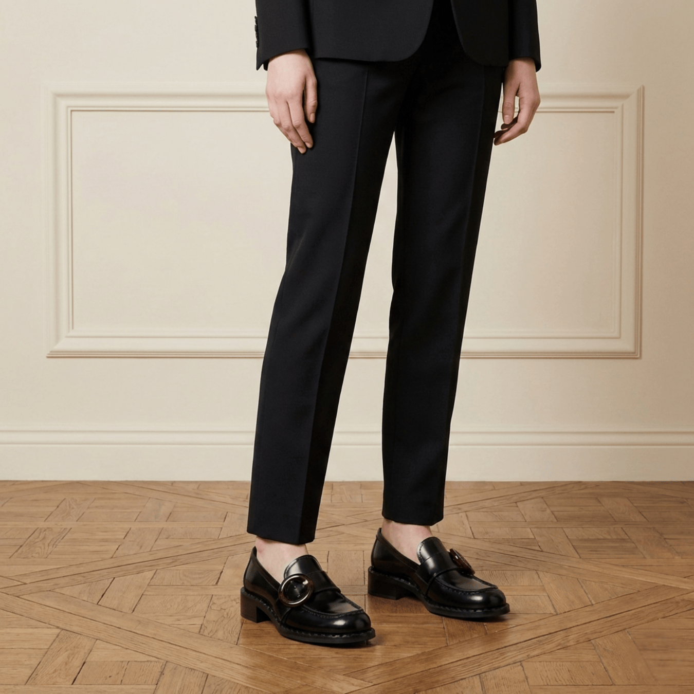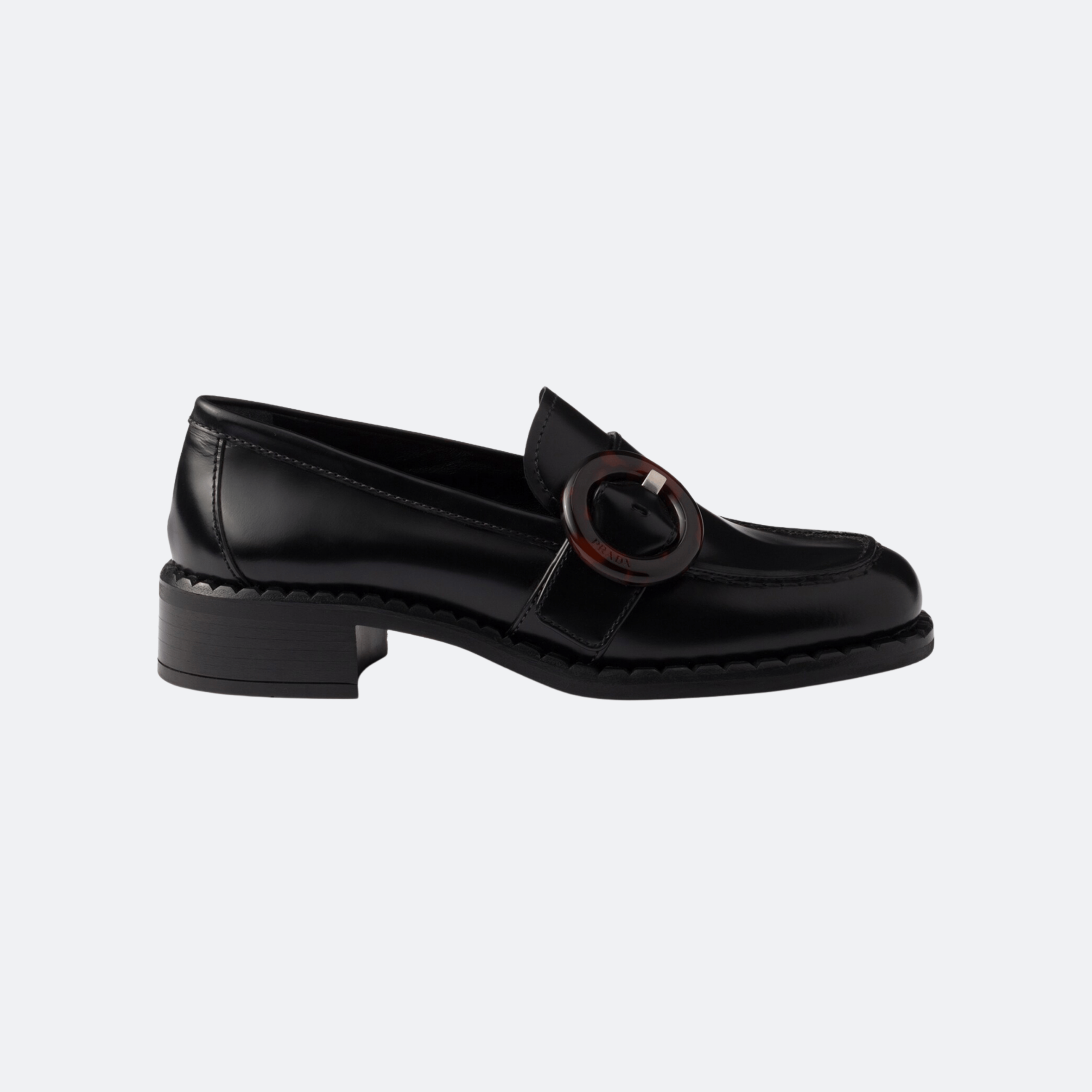 Elegant and contemporary, these Prada loafers are crafted from high-gloss patent leather, delivering a refined mirror-like finish. The design features a classic rounded-toe silhouette elevated by a distinctive oversized circular buckle detail across the vamp. The structured sole adds a modern edge while maintaining a sophisticated luxury aesthetic. Ideal for both tailoring and elevated casual styling.