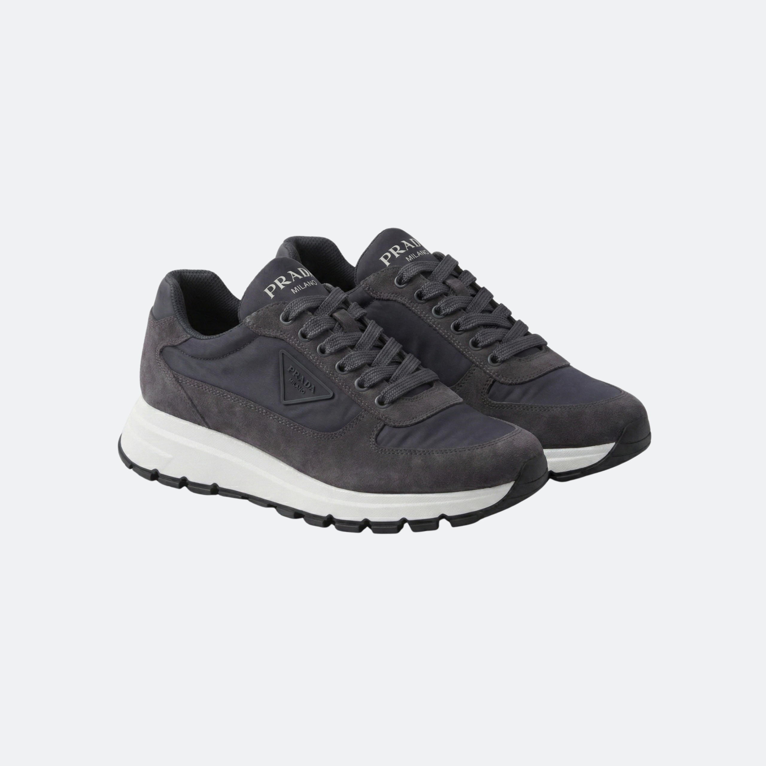 Modern Prada low-top sneakers crafted from technical nylon with suede overlays, featuring the iconic triangle logo and a lightweight rubber sole. Designed for everyday luxury, combining comfort, durability, and refined Italian style in a clean, contemporary silhouette.