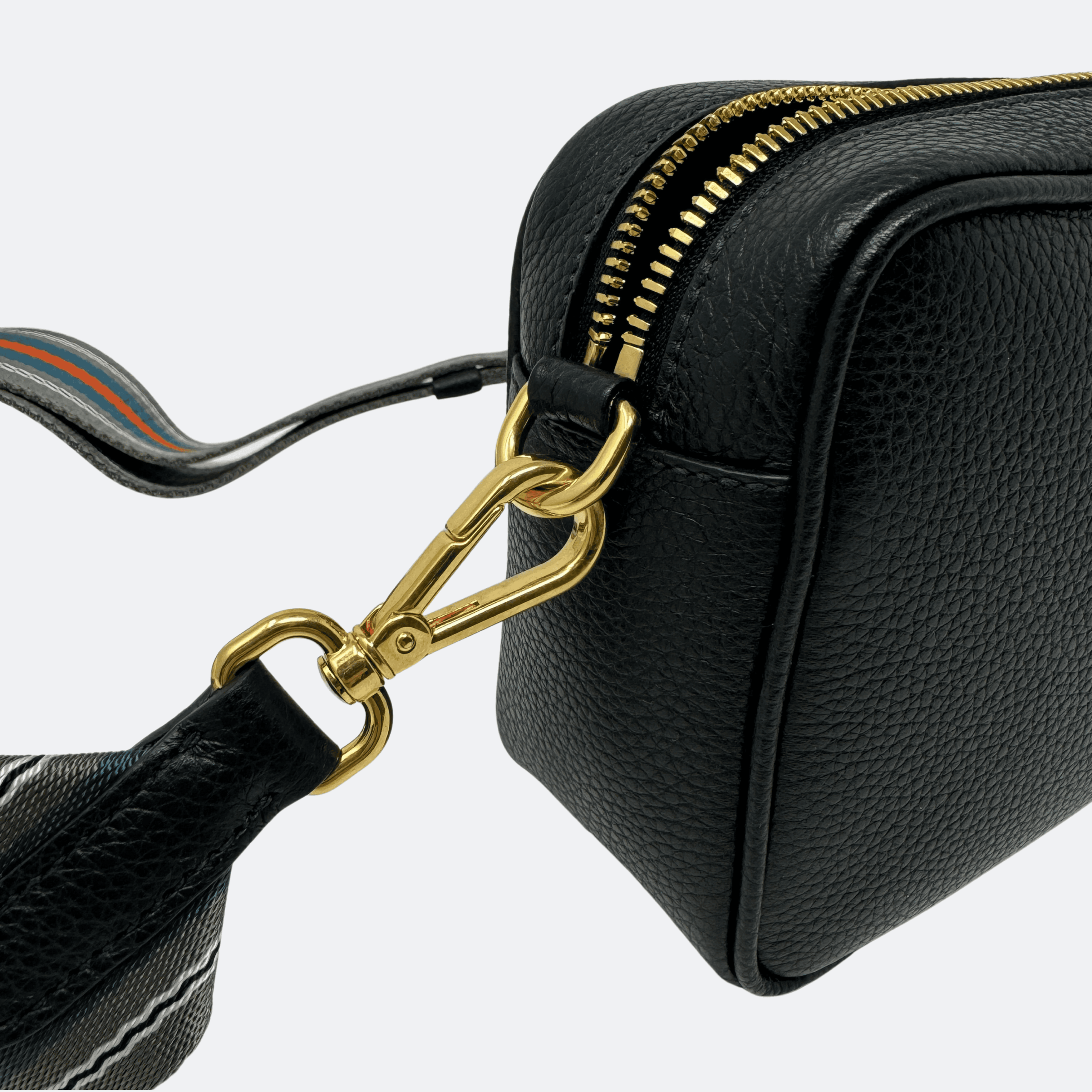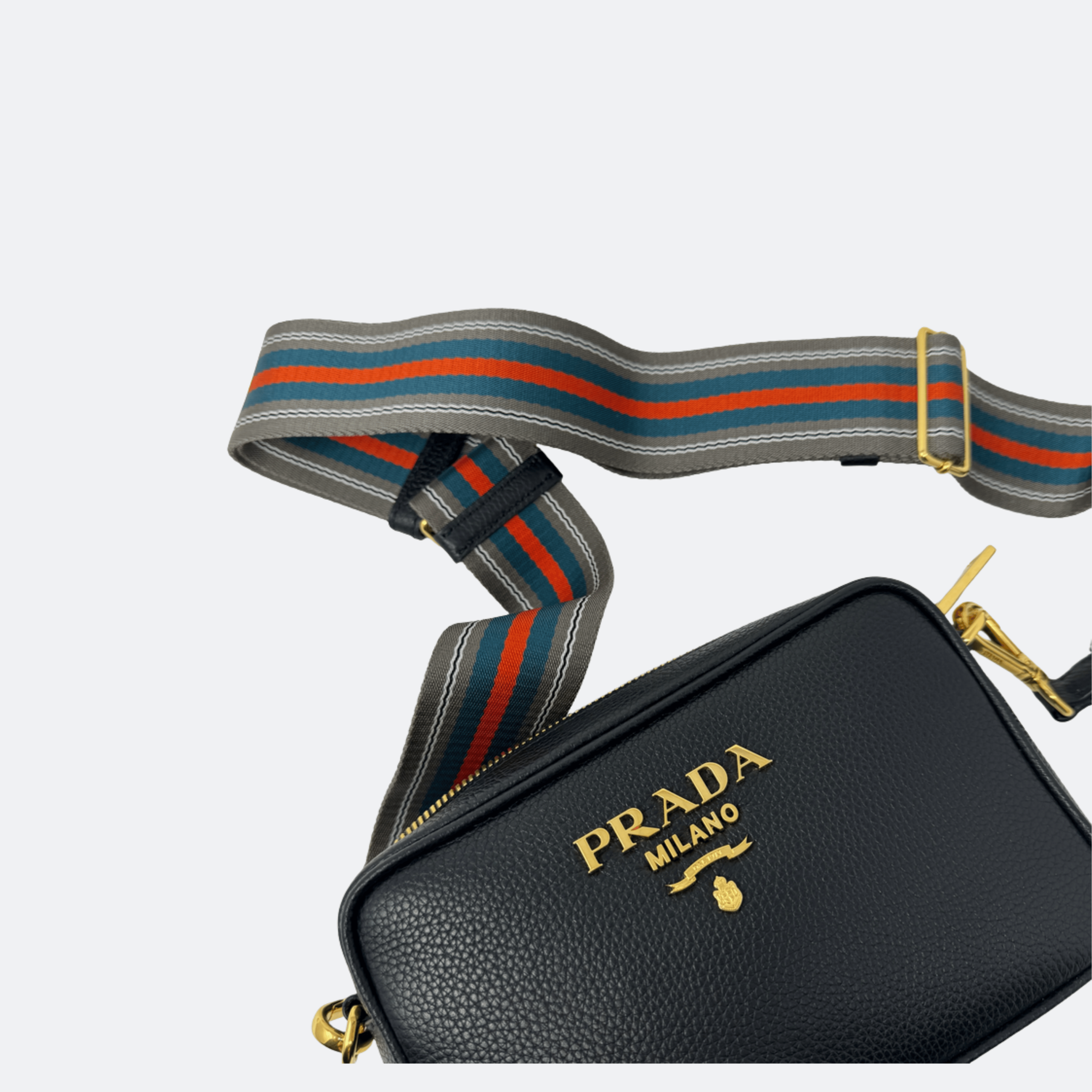 This Prada Vitello camera bag is crafted from durable grained calf leather, featuring a structured silhouette with the iconic gold-tone logo and a wide striped fabric shoulder strap for a modern contrast. Compact yet functional, it offers everyday versatility with a refined luxury finish.