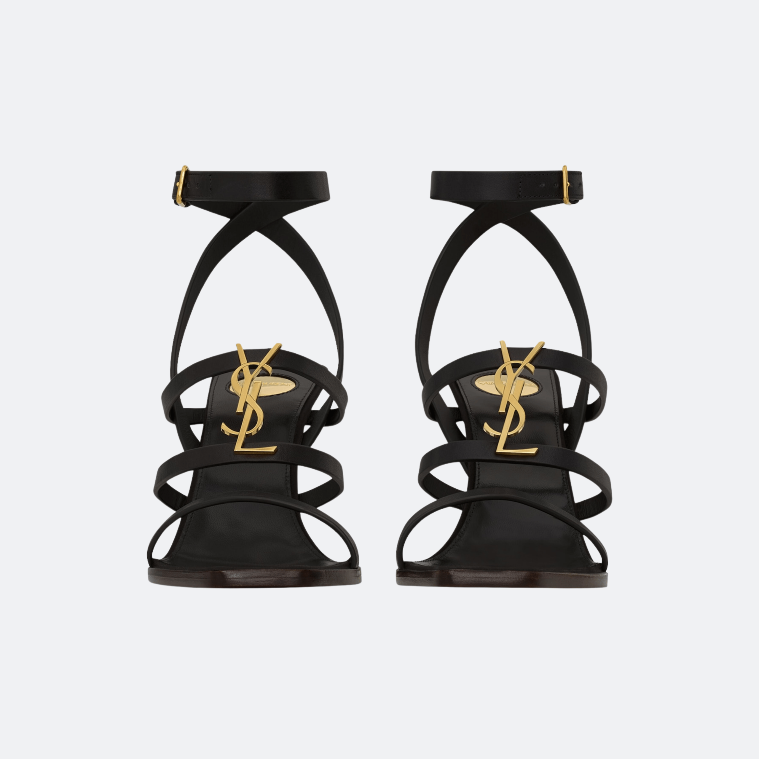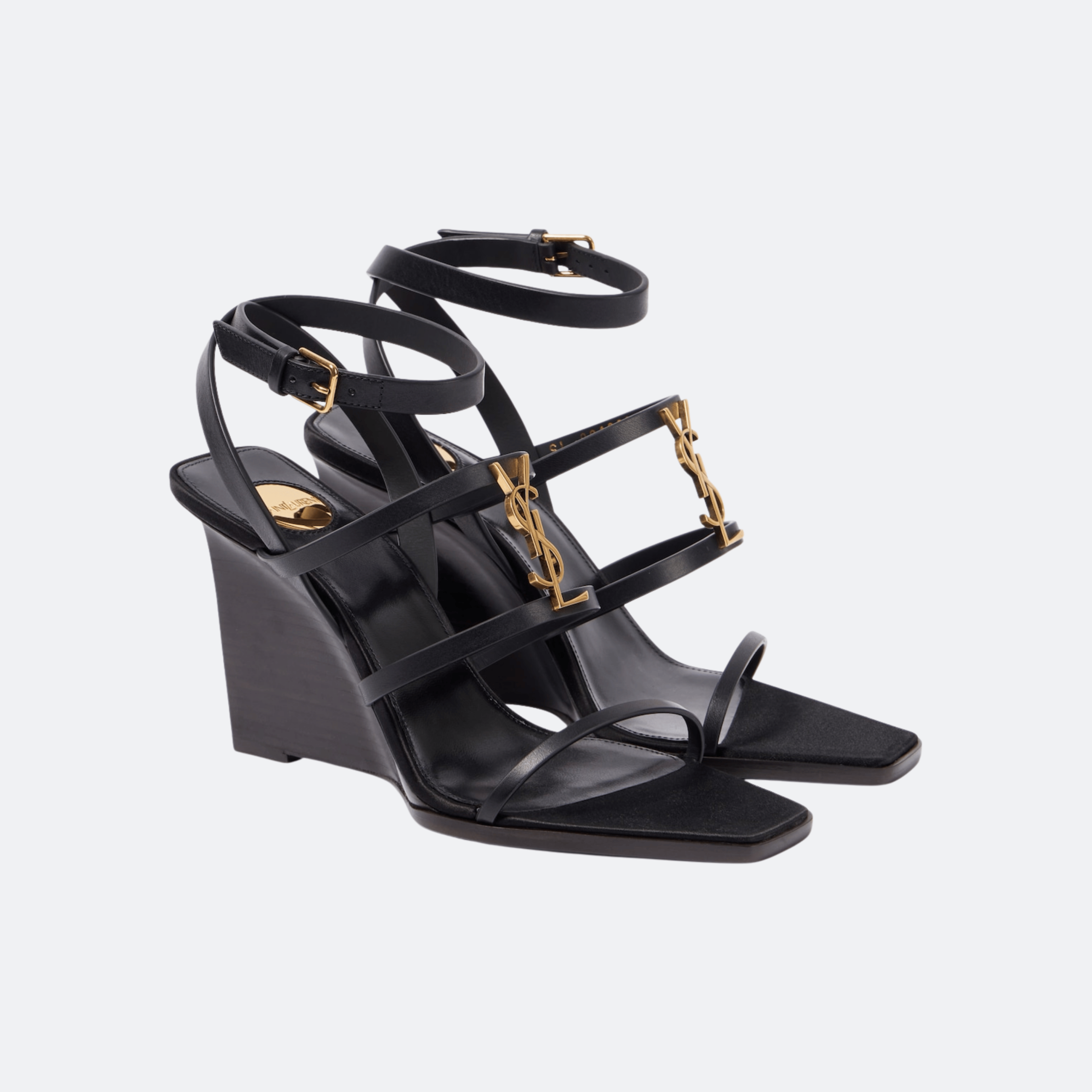 Elevate your look with the Cassandra Wedge Sandals by Saint Laurent, crafted from smooth black leather and defined by delicate straps and the iconic gold-tone YSL monogram. The sculpted wedge heel offers a refined silhouette with added comfort, making them a perfect choice for sophisticated day-to-evening styling.