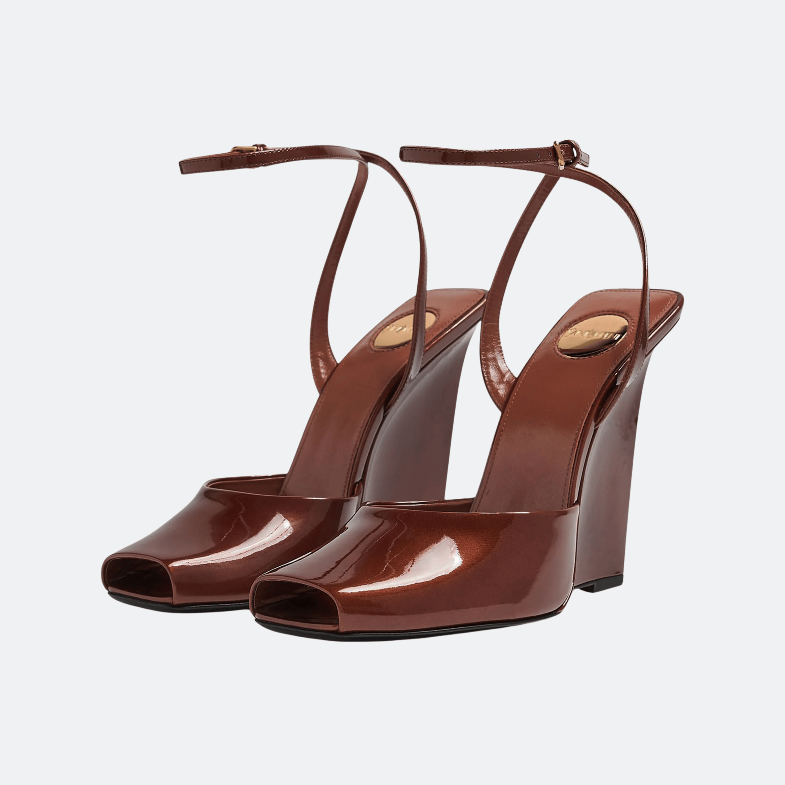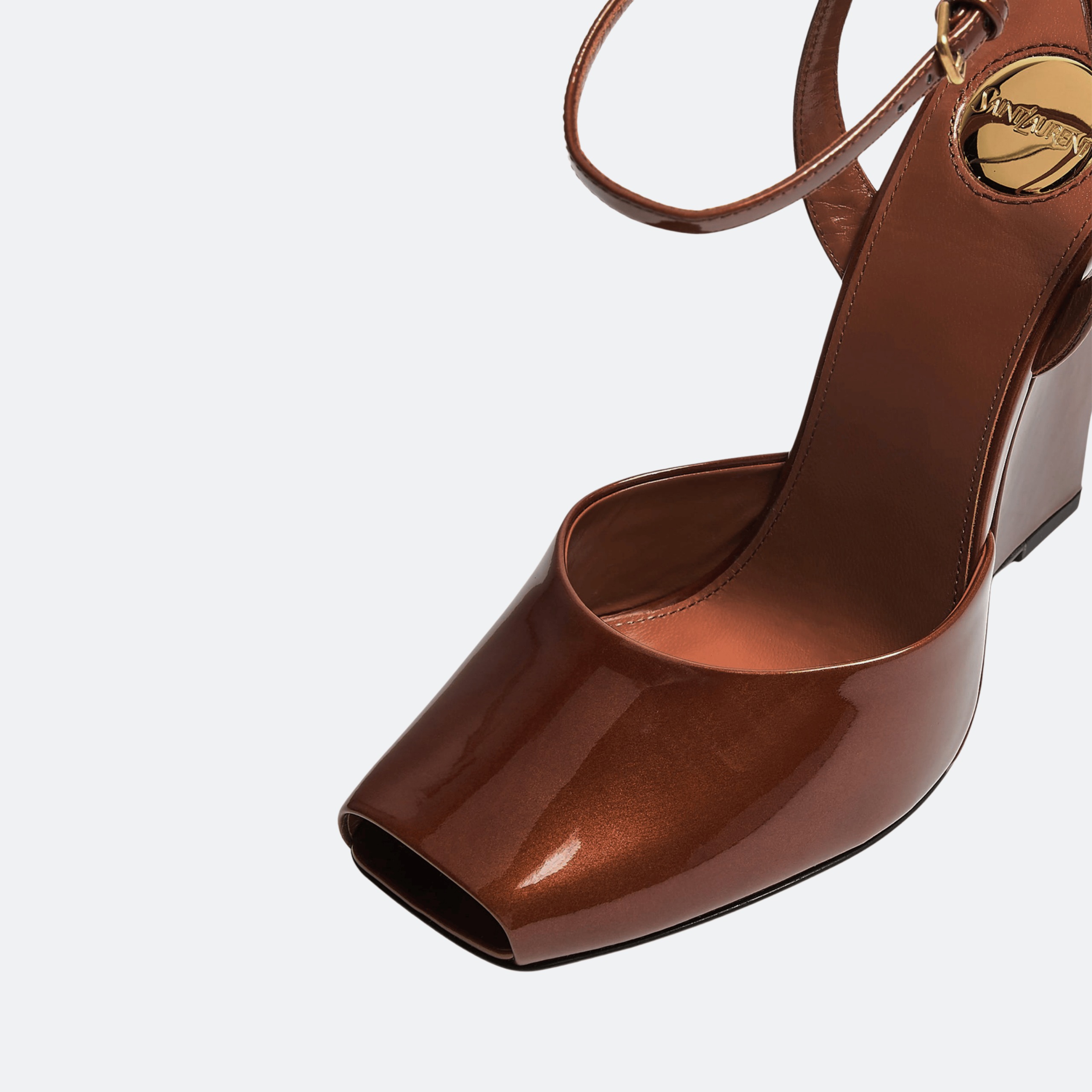 Saint Laurent Patent Leather Wedge Slingback Sandals – Cognac Brown