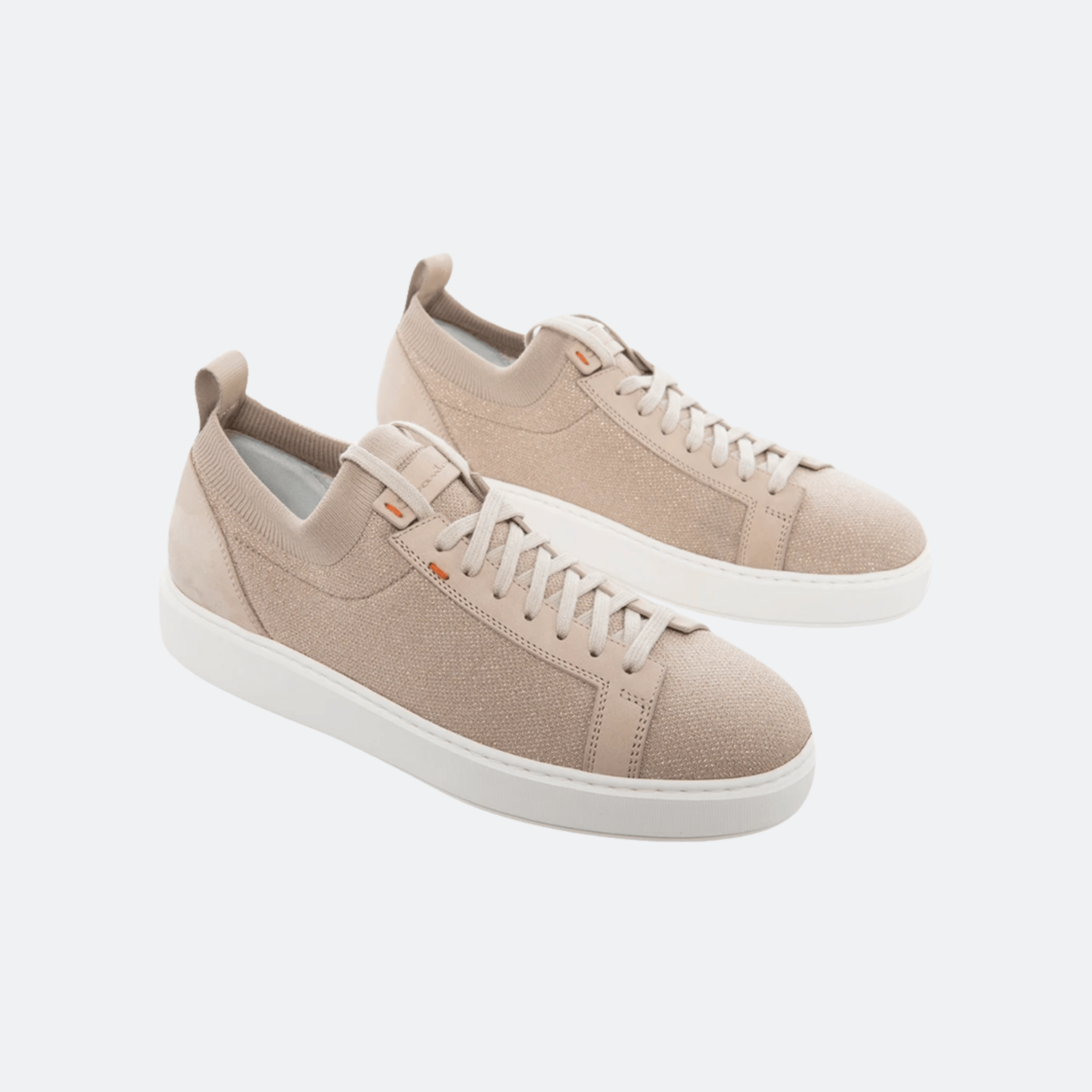 Refined and contemporary, this Santoni low-top sneaker combines breathable knit texture with smooth leather overlays for a modern luxury aesthetic. Designed with a clean silhouette, ribbed collar construction, and subtle signature orange detailing, it delivers understated elegance with everyday versatility. A lightweight rubber sole ensures comfort while maintaining a sophisticated profile.