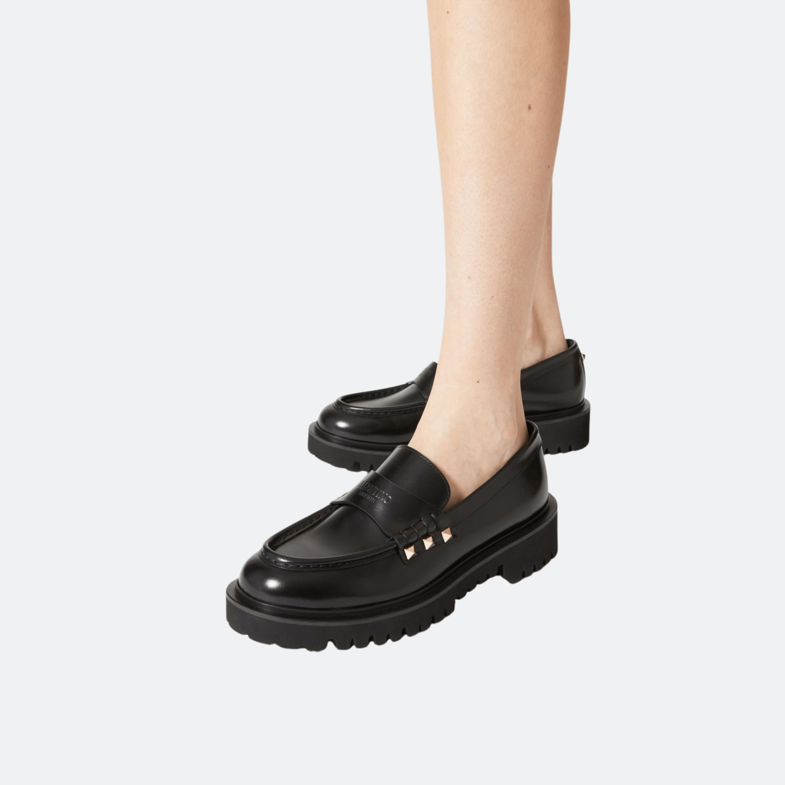 A modern reinterpretation of a classic loafer by Valentino Garavani, crafted in smooth leather and set on a bold lug sole. The design is elevated with signature Rockstud detailing at the strap, combining timeless elegance with a contemporary, fashion-forward edge.