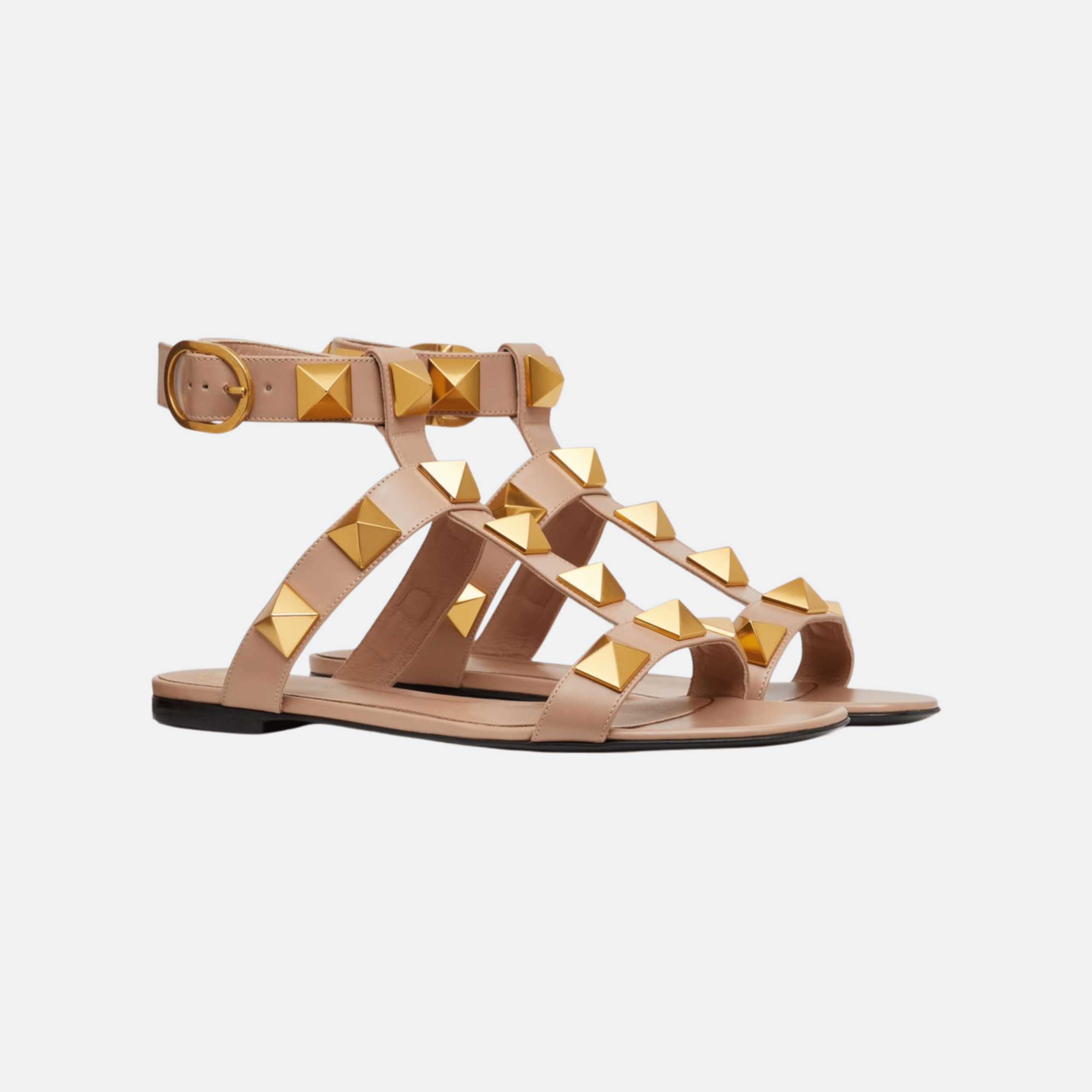 Crafted from smooth calfskin leather, this flat sandal features structured straps that contour the foot with a clean, minimal silhouette. The design is defined by oversized Roman Stud embellishments in a polished gold-tone finish, adding dimension and a distinctive house identity. An adjustable ankle strap with a rounded buckle ensures a secure and personalized fit, while the flat leather sole offers comfort for all-day wear. The refined construction highlights Valentino’s craftsmanship with a contemporary edge.